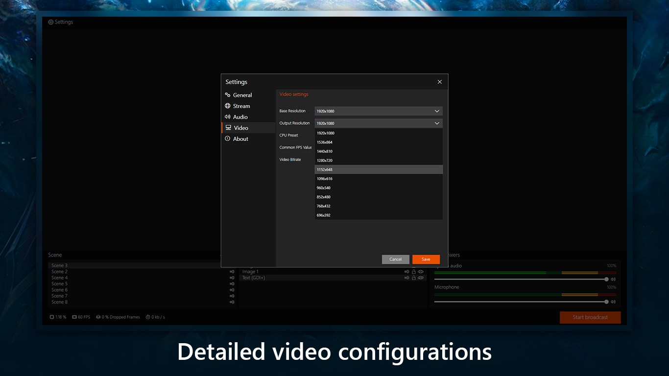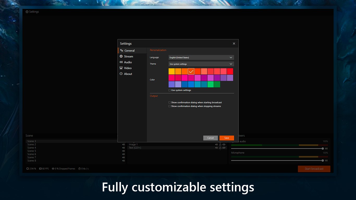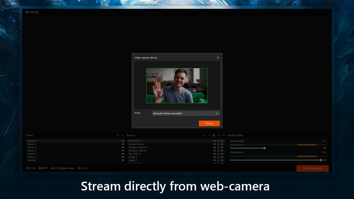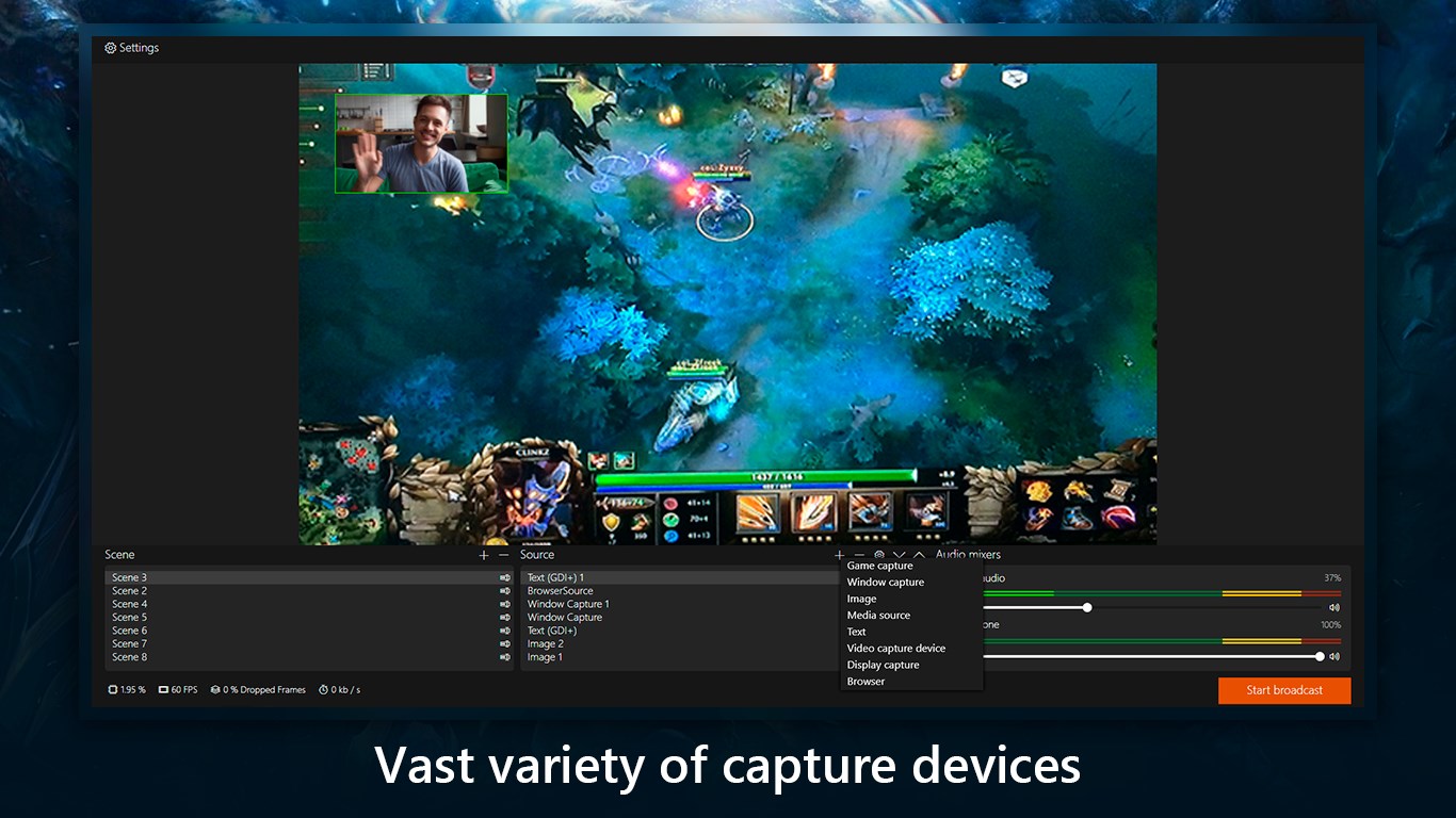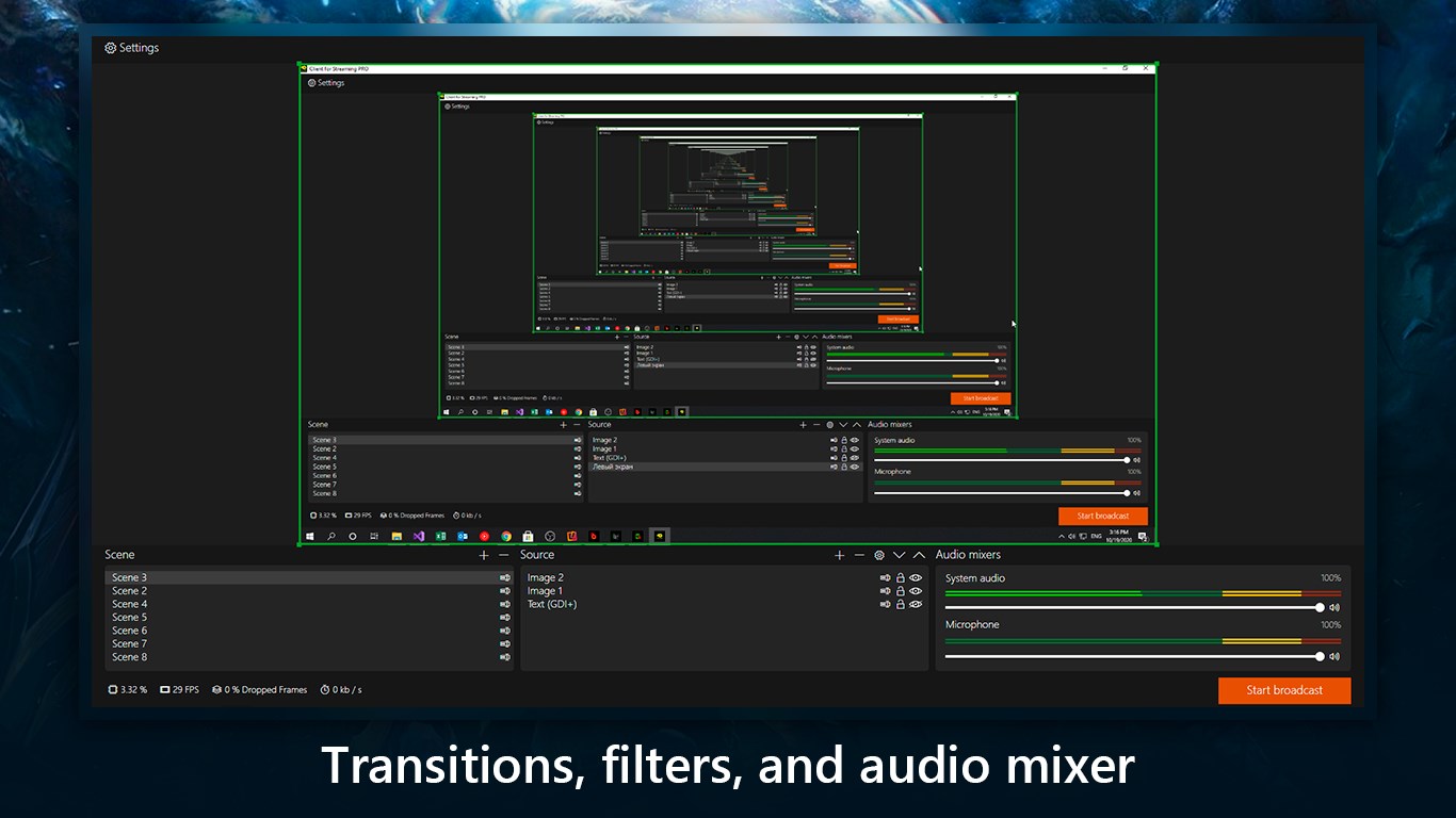 Start streaming in minutesStreaming from multiple monitors simultaneouslySupport for audio, video, image, web browser, and graphics sourcesStreaming from web-cameraSupports video recording or RTMP live streamingCapture only a certain area of the screenTransitions, filters, and audio mixerThe vast list of supported streaming servicesPlenty of content creator toolsIntuitive User InterfaceMultilanguage