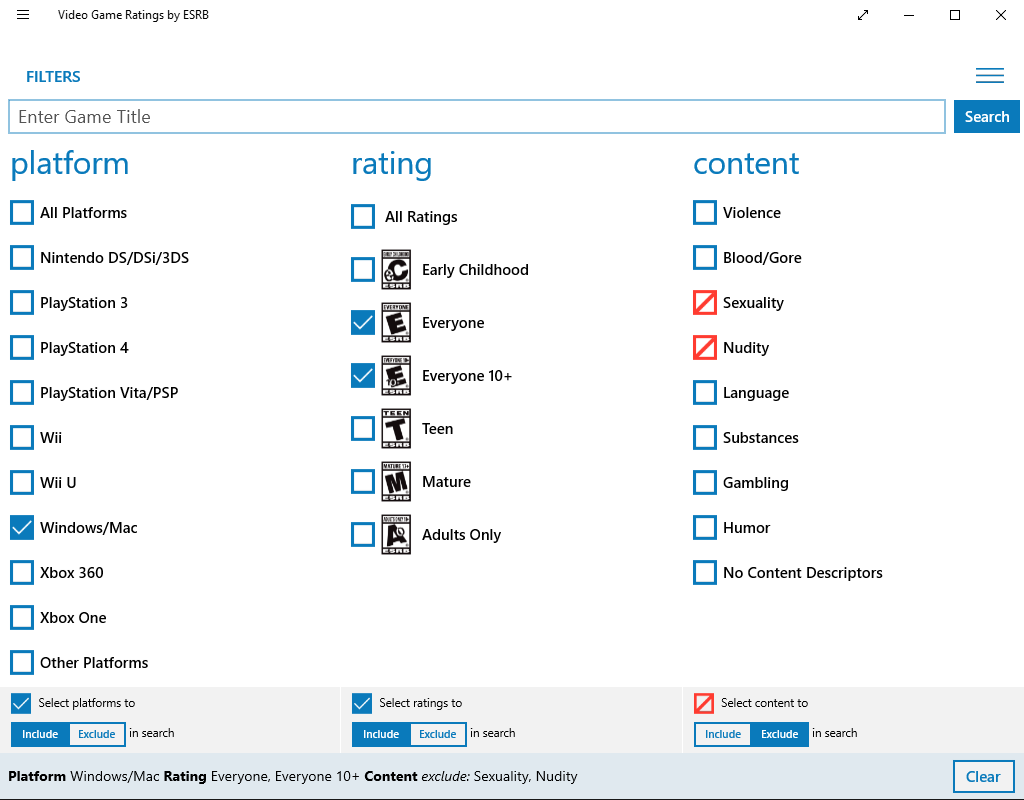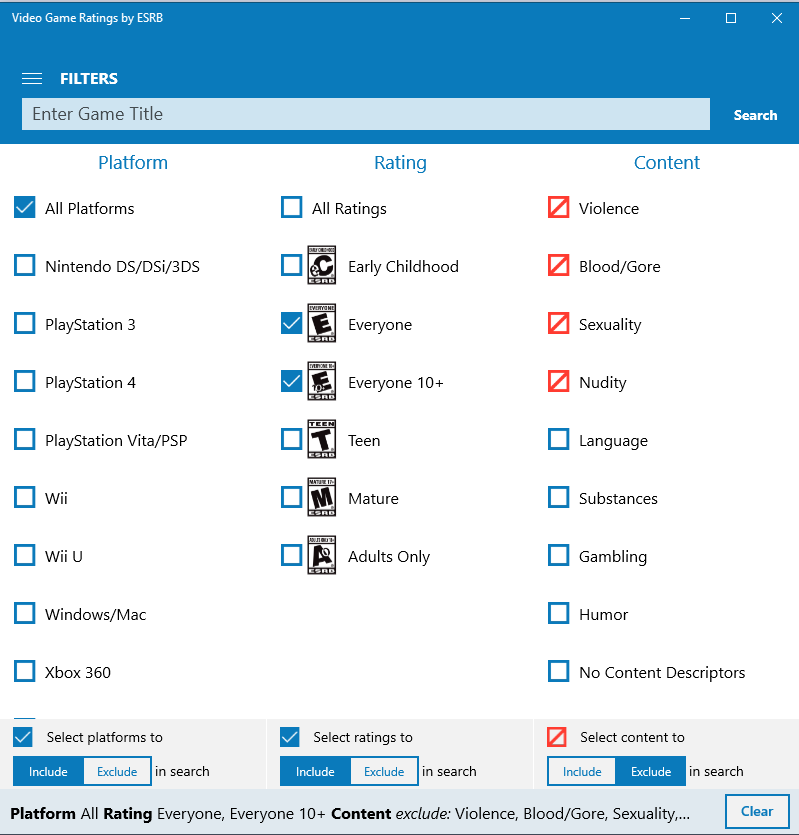 Access official ESRB video game ratings and rating summariesMake informed decisions about which computer and video games are appropriateSearch by entering a video game title, platform, rating, or contentShare your search results with friends and family via Facebook, Twitter or Email