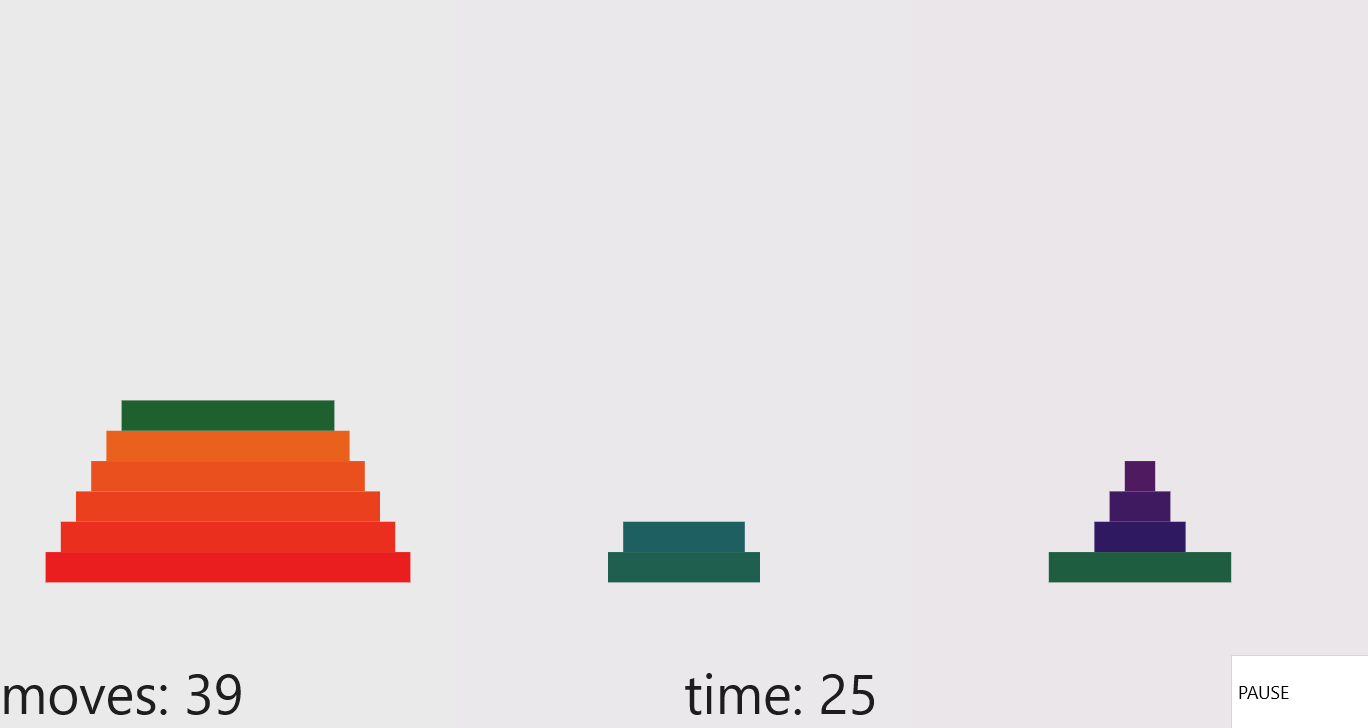 Tower of Hanoi, a mathematical puzzle game. Only one disk can be moved at a time. No disk can be placed on a smaller disk. Use up to 1000 disks!