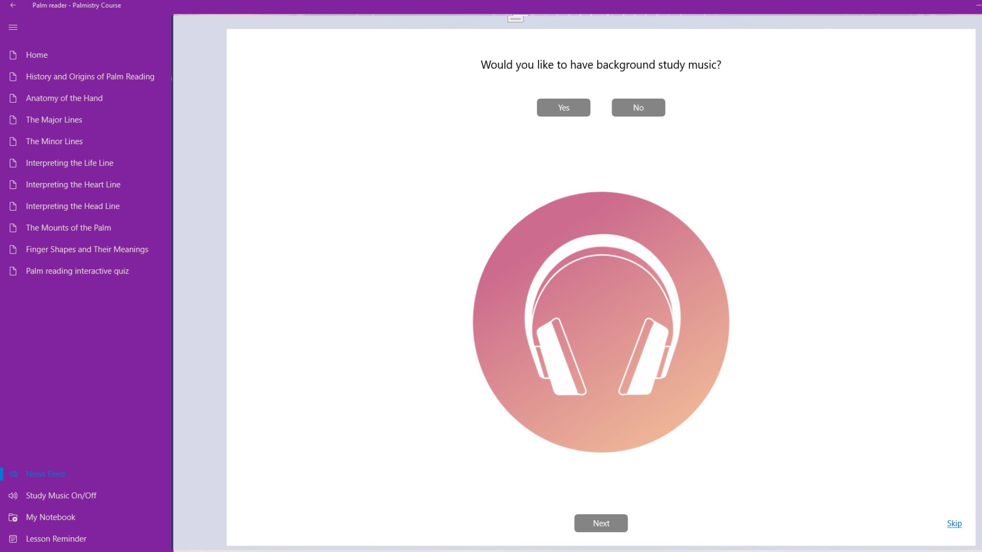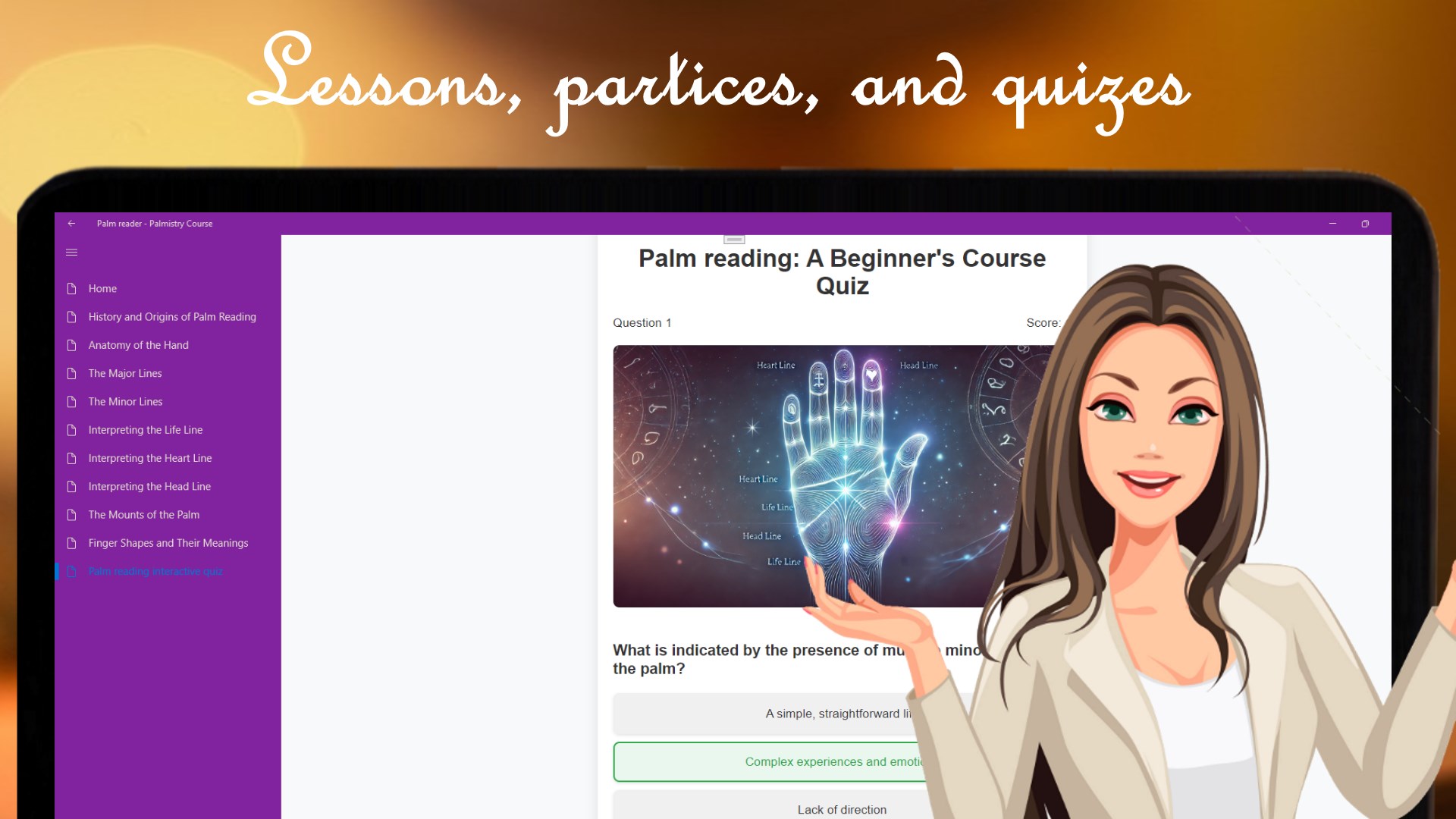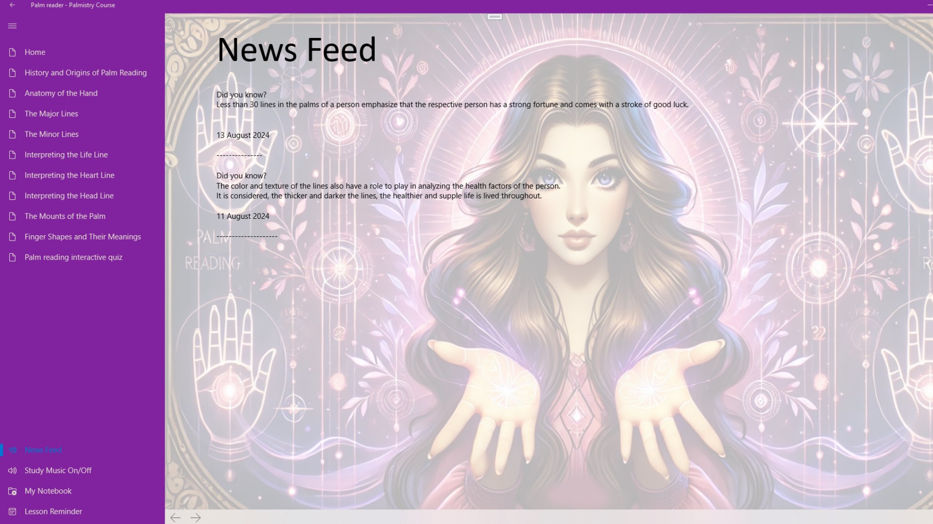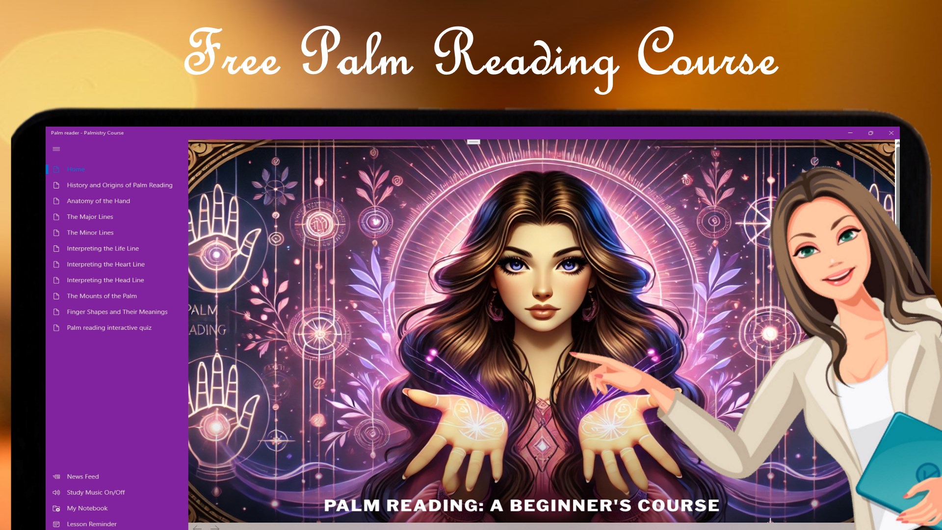 Use the in-app notebook to complete tasks, write notes, and ideasUse the in-app scheduling system to help you complete the journey.Enjoy our live feed about palm reading, life palmistry, astrology, fortune teller, horoscope, and more psychic reading newsLearn to become a palm reader - palm reading step by step course to the paranormalAnatomy of the HandThe Major LinesThe Minor LinesInterpreting the Life LineInterpreting the Head LineThe Mounts of the PalmFinger Shapes and Their MeaningsInterpreting the Heart LinePalm reading interactive quiz
