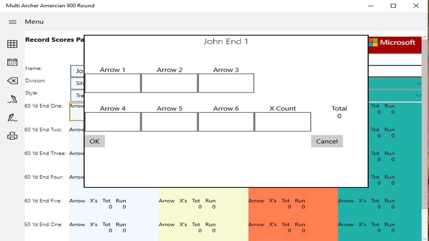 Multi Archer American 900 Round is a Windows 10 UWP application designed to provide archers the means to record their scores in shooting an American 900 Round, up to 4 archers scores maybe tracked with each round. The application has the ability to classify each archer by Division and Style, it comes with a number of pre-defined Divisions and Styles and provided the capability to add, change or delete them. Selecting a Division and or Style is not required. Scoring is accomplished by touching the end; which activates the scoring dialog and allows the data to be entered. The review and deletion of saved rounds is included as well as the ability to print scores of saved rounds, printing also provides space for the archer and scorers to sign the round.