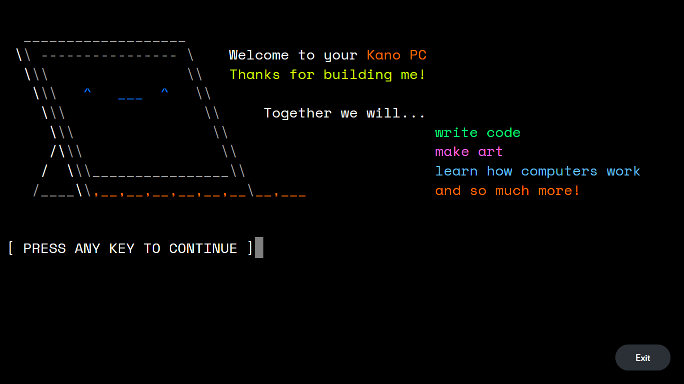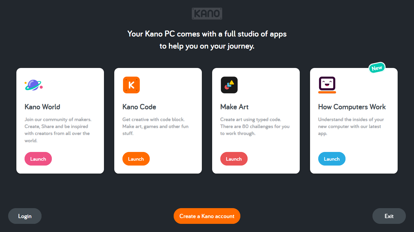 Start your Kano PC experience here. Write your first line of code and set up your Kano PC with this app.