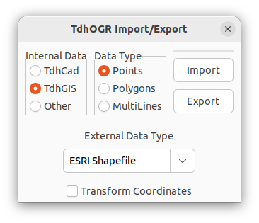 TdhOGR translates vector data between various formats while optionally transforming the coordinates to a different reference system. While TdhOGR was developed primarily for translations involving TdhGIS or TdhCad formats to and from other vector formats, it can also perform translations involving other formats to and from other formats. TdhOGR uses the GDAL and PROJ libraries.