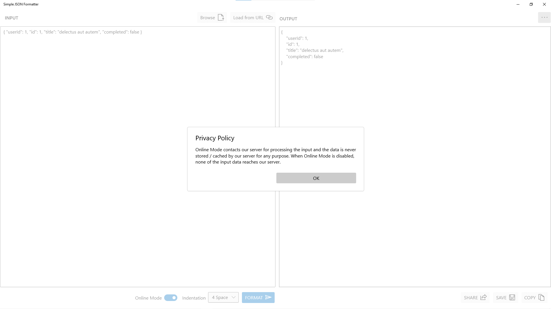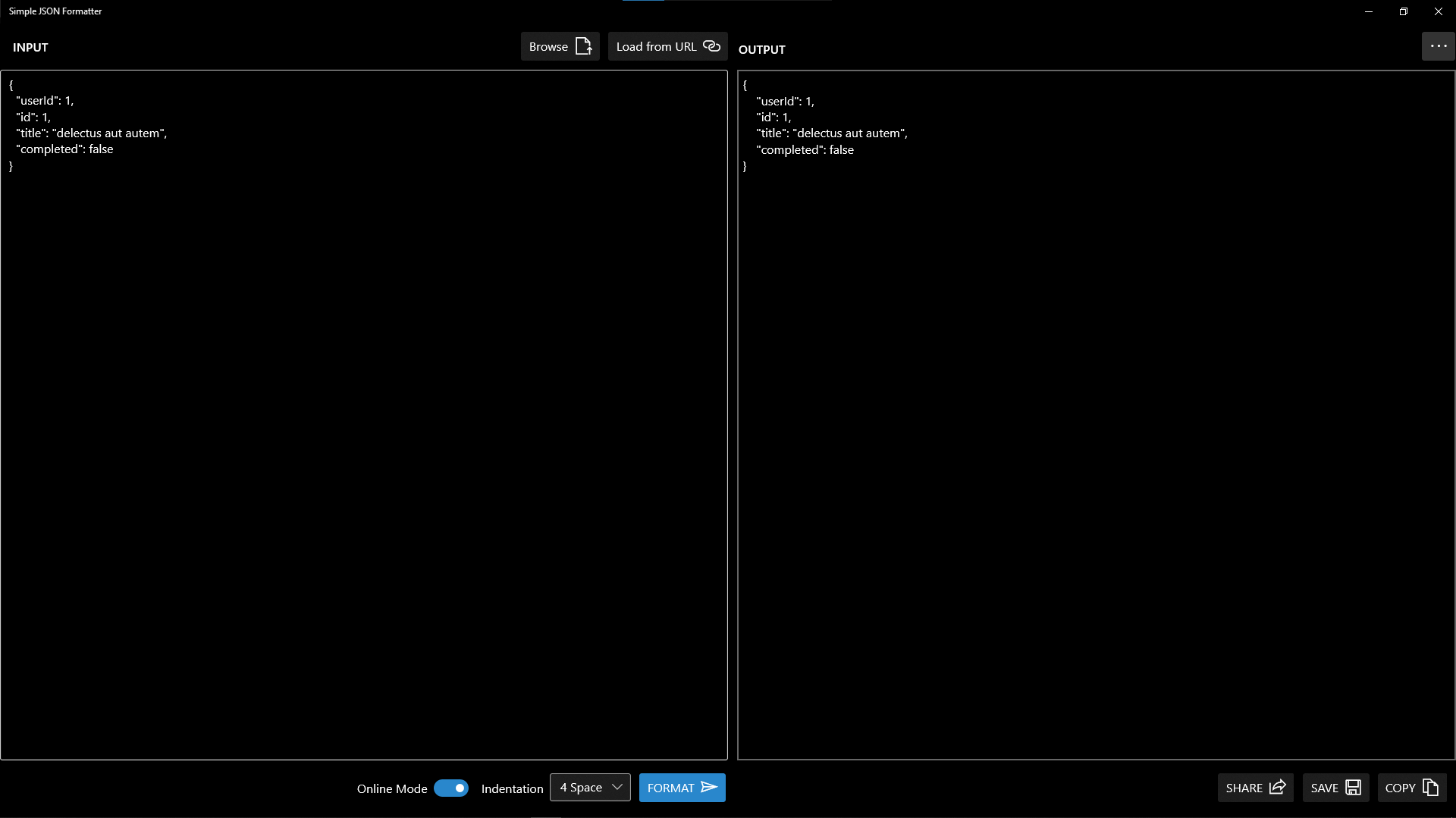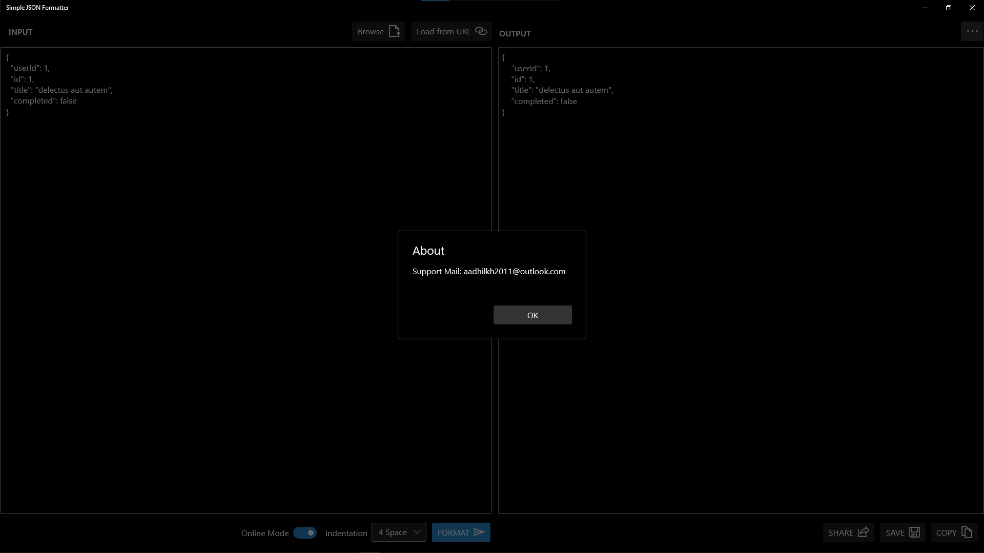 JSON FormatterSupports Online Mode for JSON FormattingSupports custom indentation for JSON outputSupports loading JSON input from URLSupports loading JSON input from Local DiskSupports saving output in Local DiskSupports sharing output through Windows 10 ShareSupports copy to Clipboard of outputSupports Acrylic Effects for UISupports both Dark Theme and Light Theme