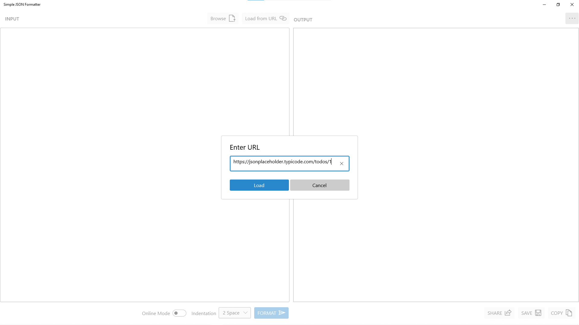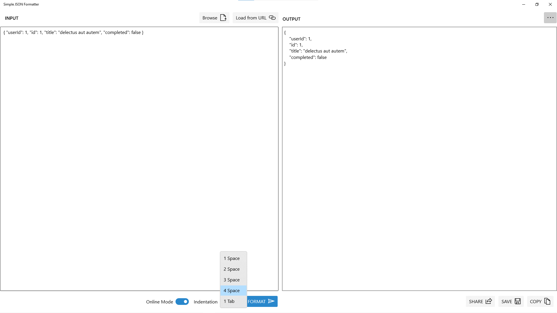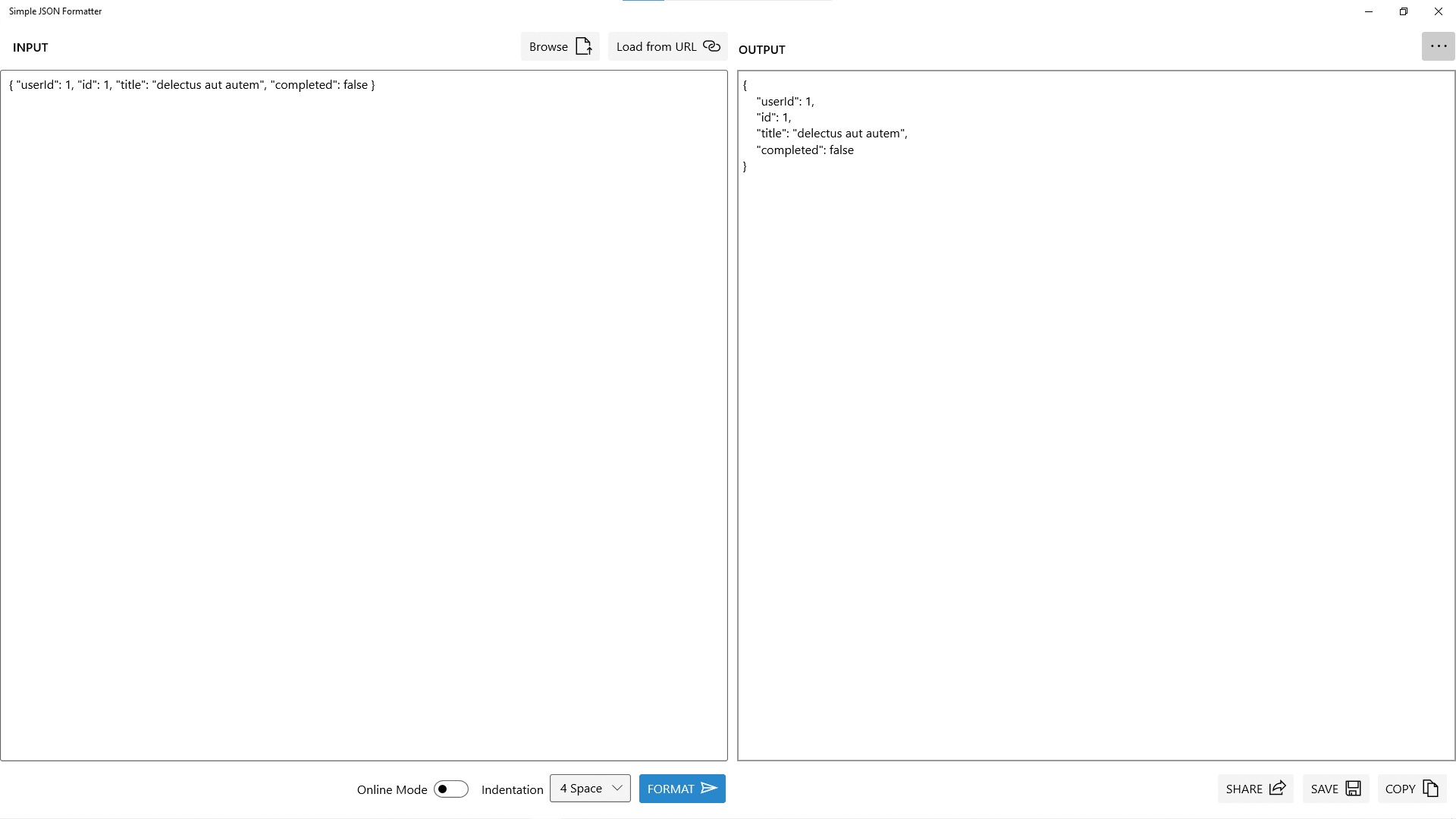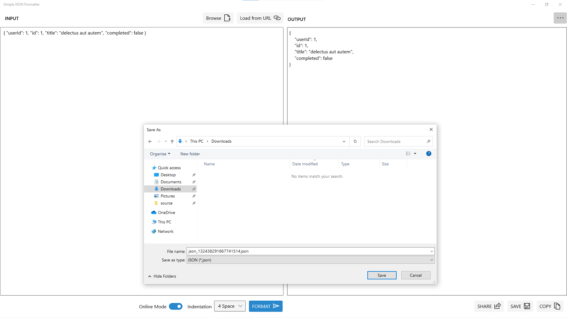 JSON FormatterSupports Online Mode for JSON FormattingSupports custom indentation for JSON outputSupports loading JSON input from URLSupports loading JSON input from Local DiskSupports saving output in Local DiskSupports sharing output through Windows 10 ShareSupports copy to Clipboard of outputSupports Acrylic Effects for UISupports both Dark Theme and Light Theme