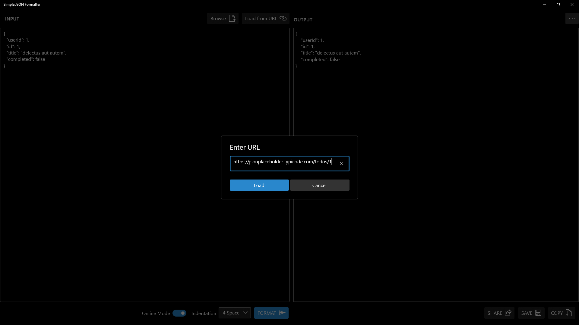 This app allows to fetch JSON data directly from URL or local disk for processing. Output can be shared, saved to local or copied to clipboard.