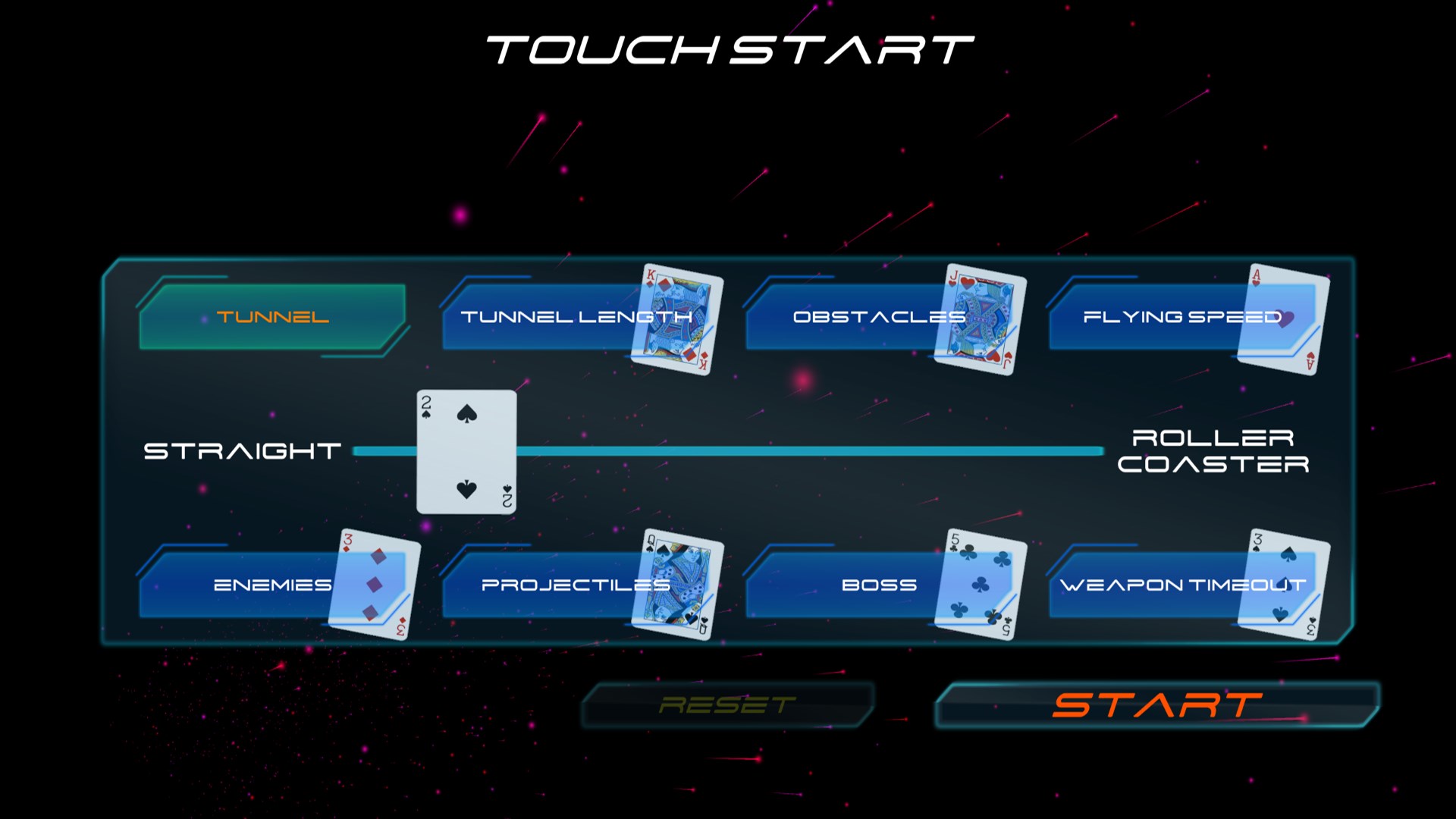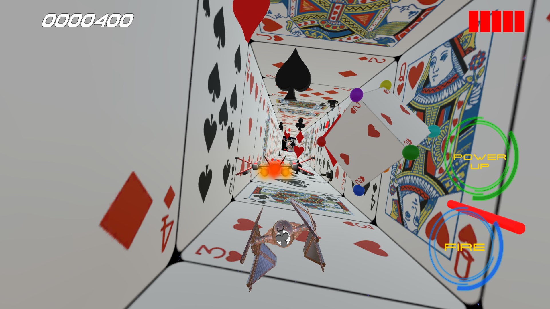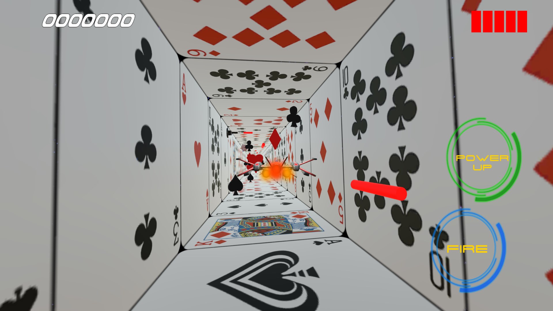 Full 3D space shoot-them-up game inspired by Konami's Gradius / Salamander. Fly through a roller-coaster-like tunnel made of playing cards, destroy various enemies and obtain more powerful weapons.