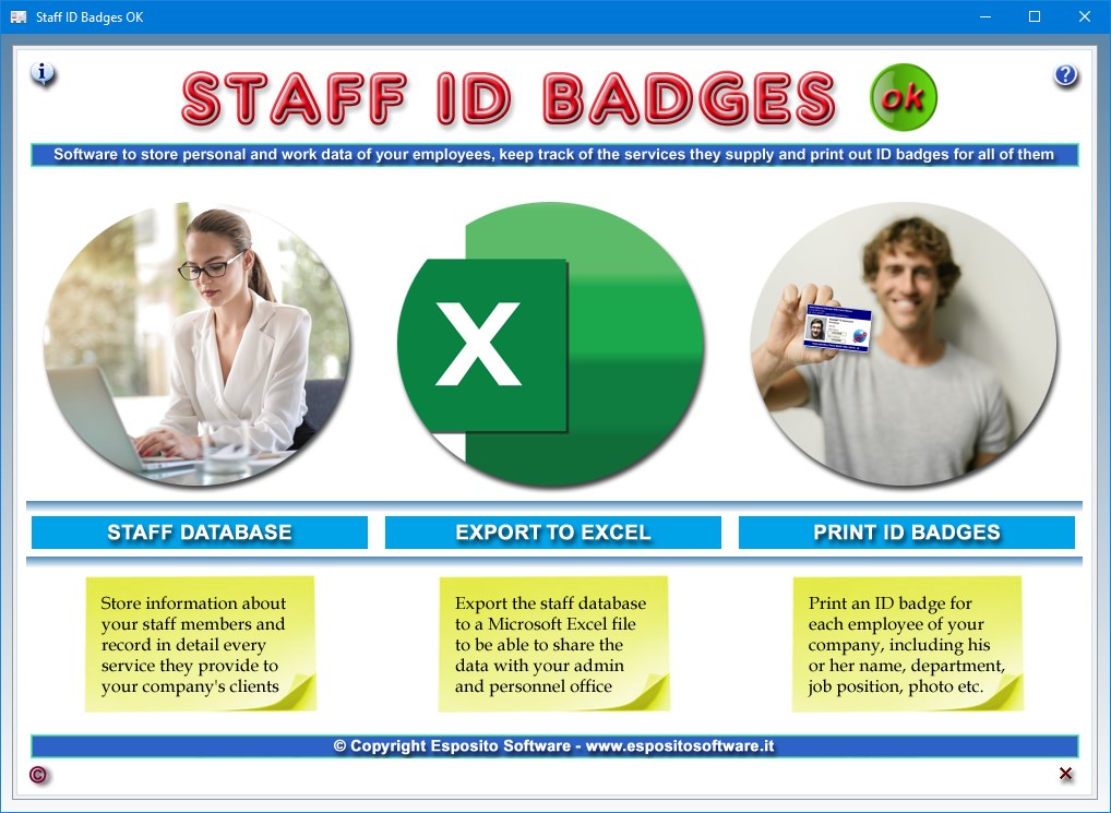 Staff ID Badges OK is very user-friendly software that allows you to create a database of employees, partners, members of associations or workers of any kind, print their ID badges complete with photos acquired through a webcam or digital camera and, finally, keep track of the services provided by each staff member. Moreover, a special app allows you to export the staff database to a Microsoft Excel file, so that you can share the data with people who do not have Staff ID Badges OK installed on their computers.