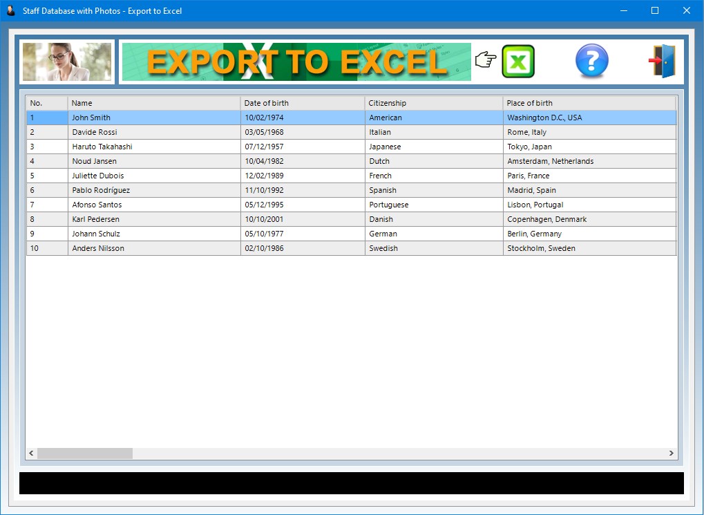 The Export to Excel app allows you to export the textual data present in the staff database into a Microsoft Excel worksheet, which can be opened with any software capable of managing files in XLS format (for example, with Open Office, Libre Office or Microsoft Office). This function allows you to share the staff data with your admin or personnel office, or anyone else who does not have Staff ID Badges on his or her PC.