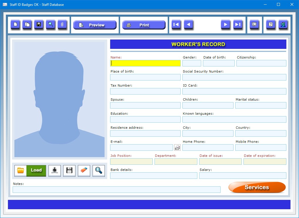 The Staff Database app allows you to store your workers' data in detail, indicating, of each one, the name, gender, date and place of birth, citizenship, Social Security Number, Tax Number, details of the ID Card, spouse's name, children, marital status, educational qualifications, known languages, residence address, city, country, e-mail address, home and mobile phone numbers, job position, department, ID badge date of issue and date of expiration, bank details, salary, any additional notes and a photo. The photo and some of the worker's data will be imported into the app for printing ID badges. The text fields with the data that will appear on the ID badge are easily recognizable as they are colored in beige.