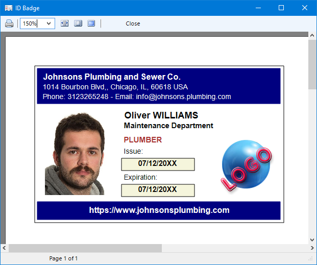 Each ID badge contains the company's logo and data as well as the employee's name, his photo, the department in which he or she works, the job position held, the date of issue and the expiration date of the ID badge. As already mentioned, the information relating to the company or association is automatically saved when you exit the window, so that you will not have to re-enter it when printing a new ID badge.