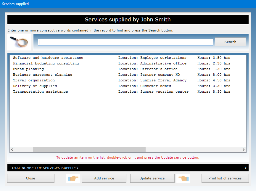 To edit a service already present in the database, you need to select it from the list with a click, press the Update service button, make the desired corrections, additions or deletions in the text fields, press Save and then Close. At the bottom of the list is the total number of services supplied by the worker.