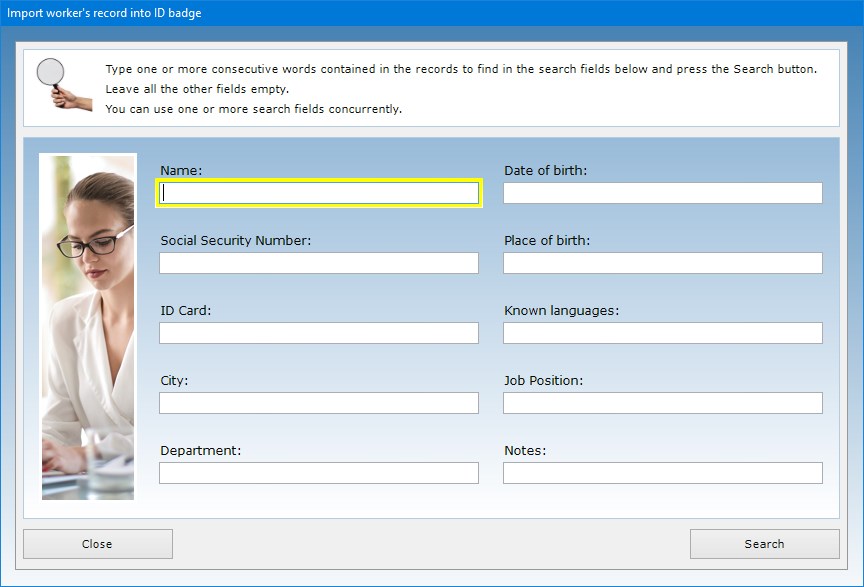 To enter a record in the database, click on the New button, fill in the relevant text fields, upload a photo of the worker and press the Save button. Remember that the text fields concerning the worker's name, job position, department, ID badge date of issue and date of expiration are mandatory since they will be printed on the ID badge. To update an existing record, you must open it using the record scroll arrows or the search function, make the desired changes and press Save. The Duplicate button is useful if you need to save two or more records with very similar data because they refer, for example, to workers with the same background. To duplicate a record, just open the one already stored in the database, click on the Duplicate button, enter the new data and press Save.