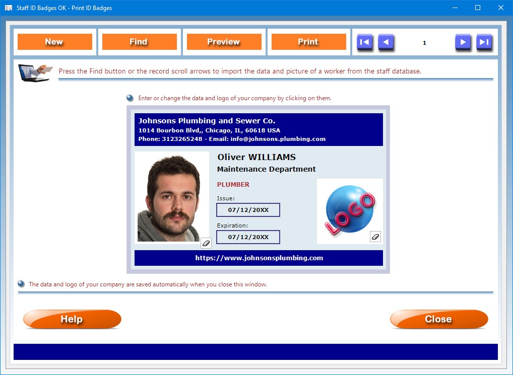 To import the photo and data of a worker into the preview of the ID badge, you can use the record scroll arrows or search the staff database using the Find button. To insert or change your company's logo and data, just click on them and follow the instructions that appear. The logo and data are automatically saved when you close the window.