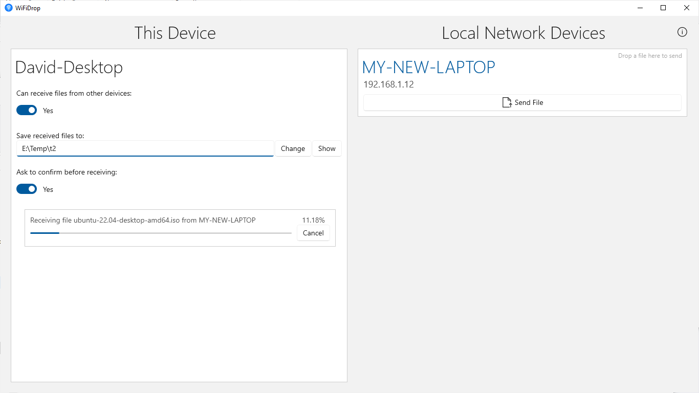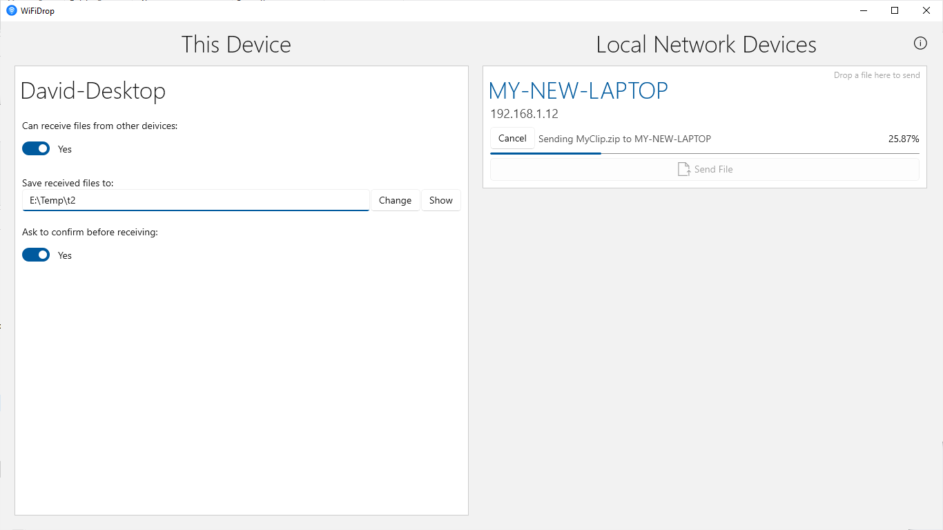 WiFiDrop is a tiny app based on .NET Desktop Runtime for sending files between two Windows devices. It works just like Apple AirDrop, but using Wi-Fi or LAN. You can even don't need a router, just create a Wi-Fi hostspot to connect two devices then use this app to send files.