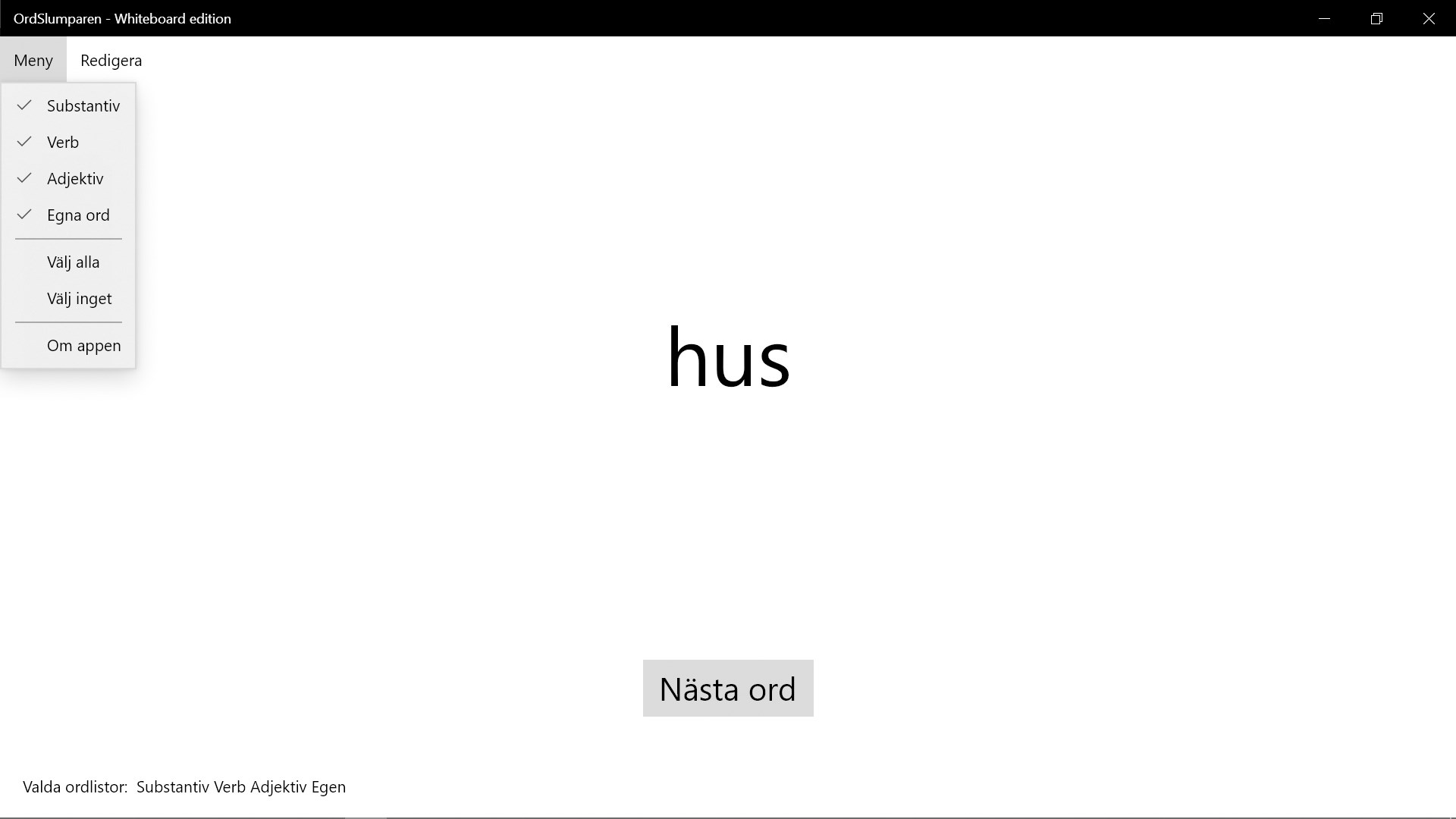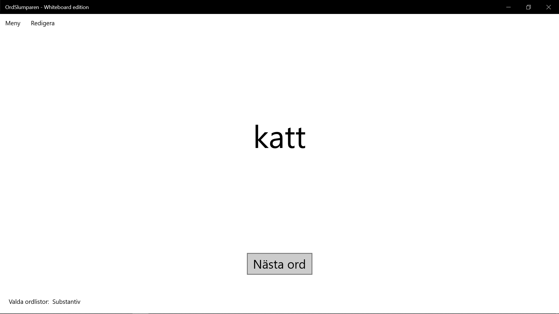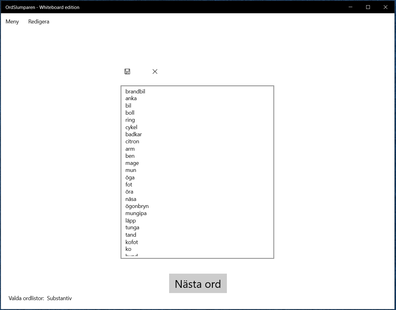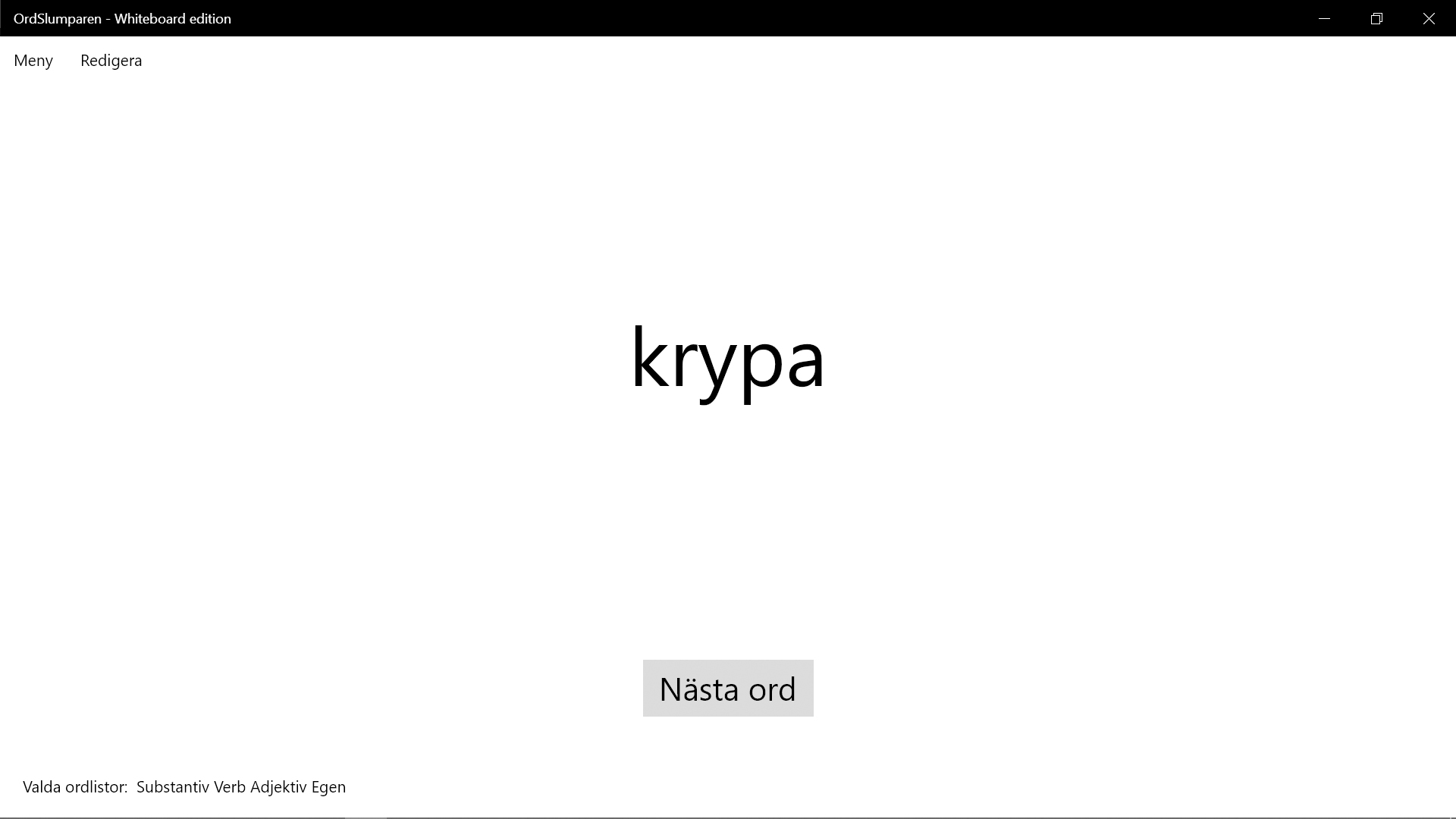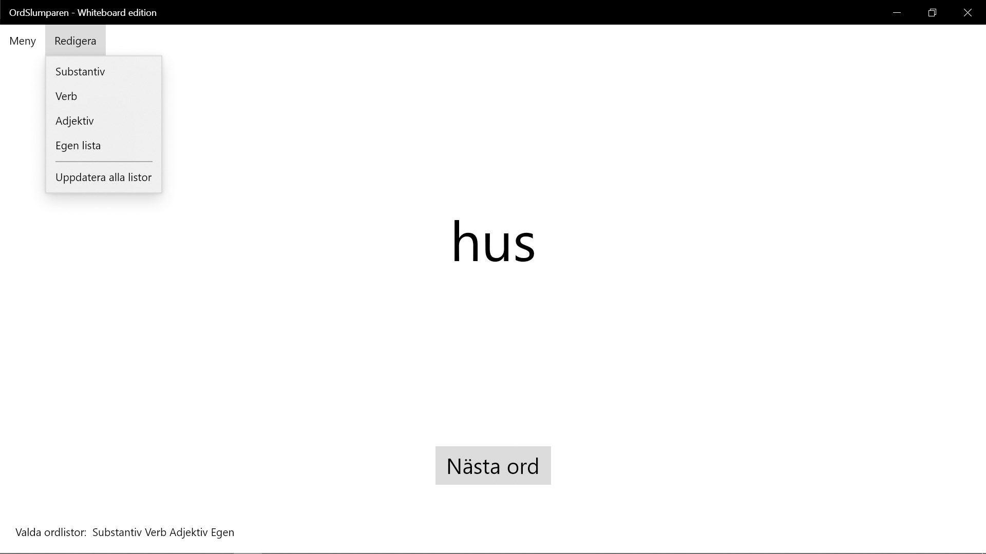 OrdSlumparen - Whiteboard edition är en app för klassrummet som slumpar fram ord från fyra olika ordlistor som användaren själv kan redigera.