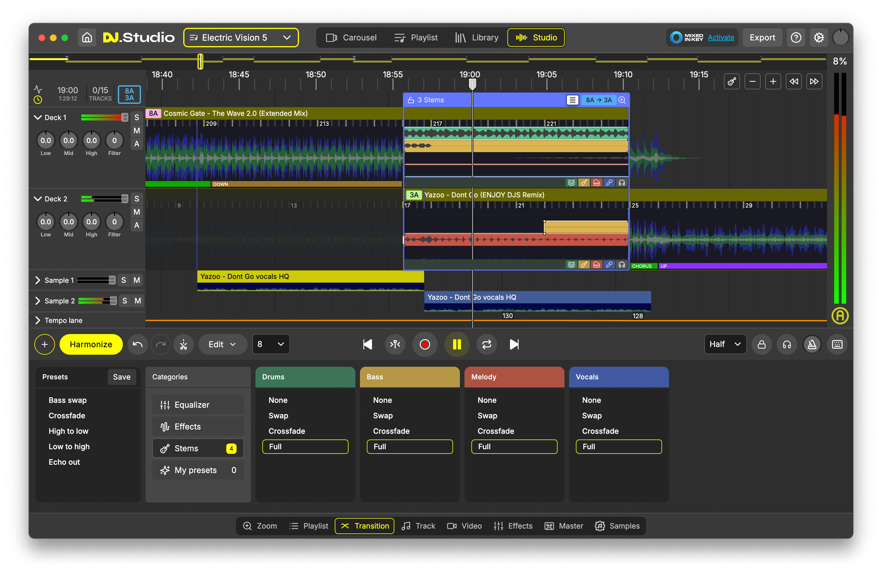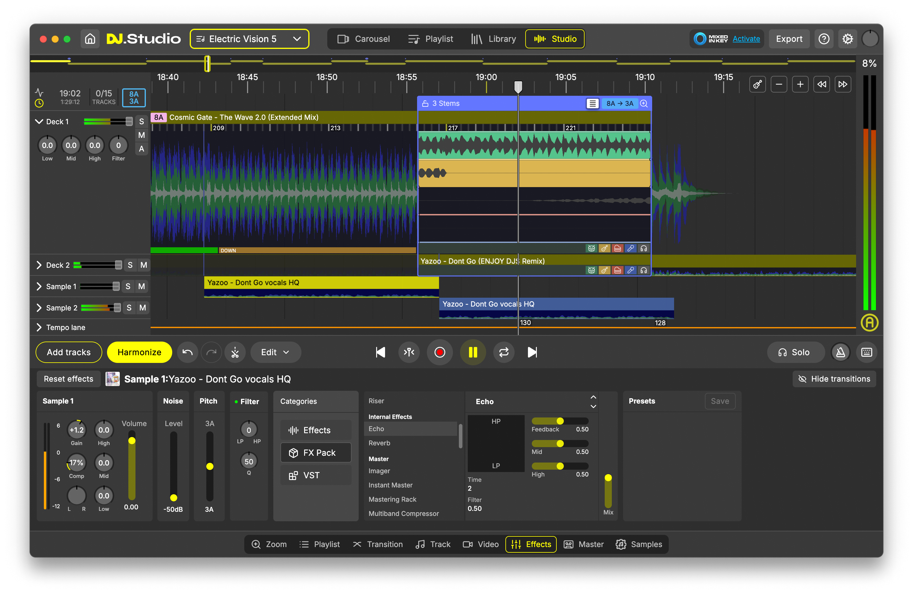 DJ.Studio excels in live set preparation, offering tools to experiment with transitions, rehearse performances, and add dynamic sample effects.