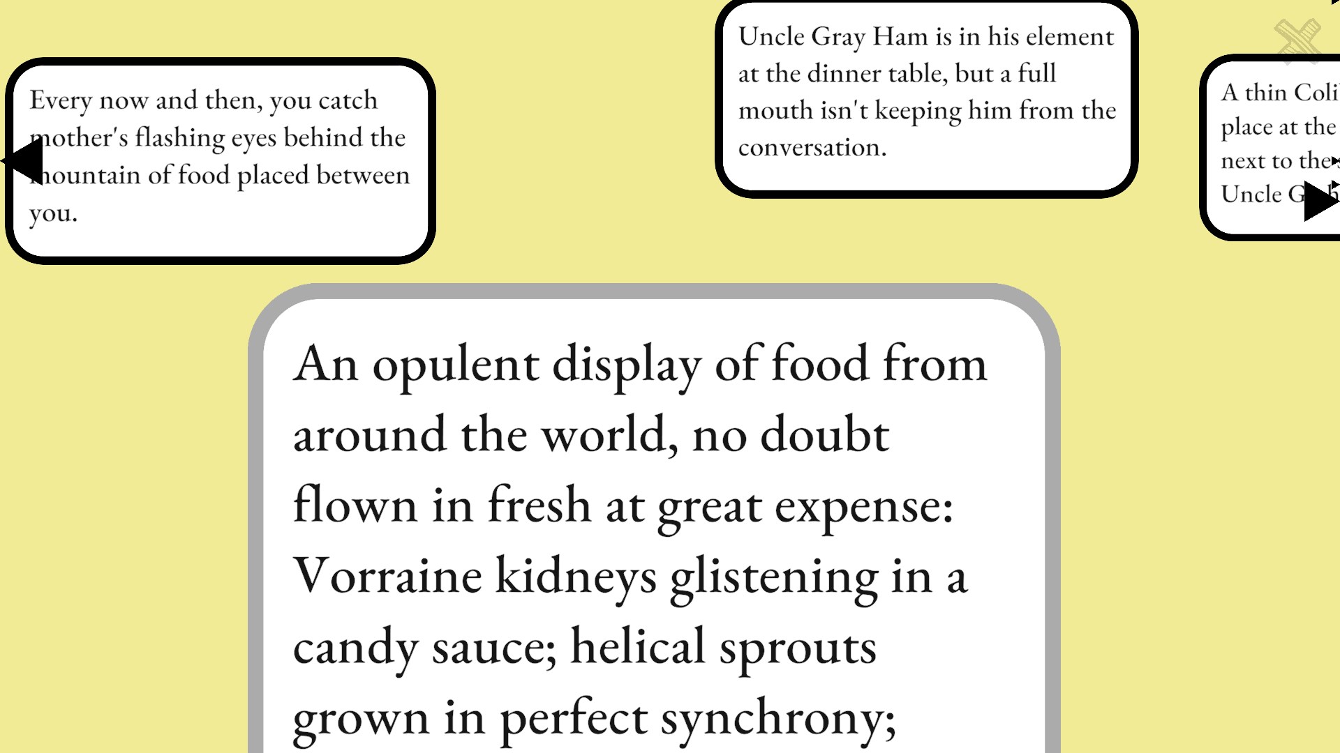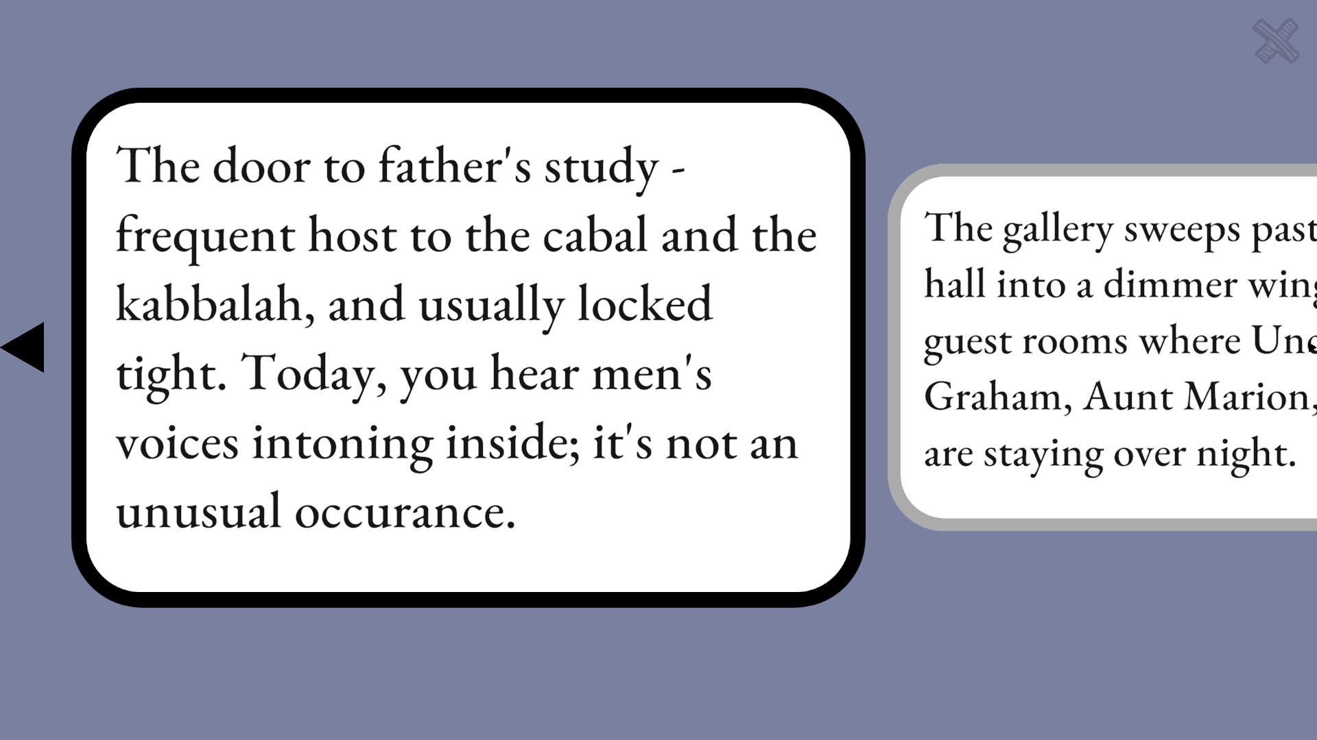 Navigate through a 3D world composed entirely of text using either a mouse or keyboard to guide your point of view. Make choices about how each character thinks in order to help them make sense of their conflicted feelings, and in the process discover where you stand in relation to your own.