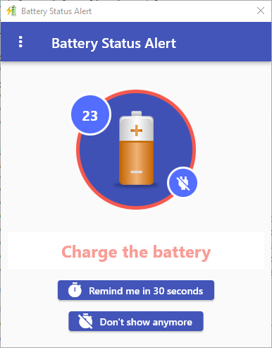 Alerts when the discharging limit is reachedAlerts when the charging limit is reachedCan configure both the limitsCan disable the monitoring of the discharging limit"Remember me in 30s" button"Stop annoying" buttonBattery details section