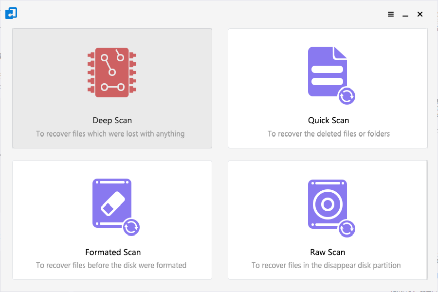 Deep Scan: According to the file structure matching file type, all files on the disk will be found, which takes a long time. Data loss from any cause can be recovered.Quick Scan: It is suitable for recovering deleted files. If no disk write operation is performed after data loss, the recovery probability is very high.Formated Scan:Suitable for misformatting partitions, missing local disks or folders.RAW Scan:Suitable for partition loss, where one or more local disks of the hard disk are missing.