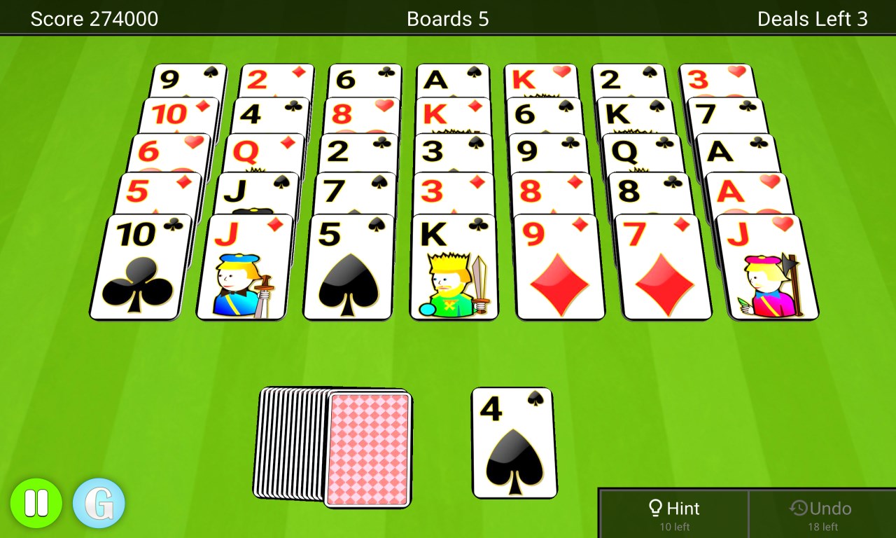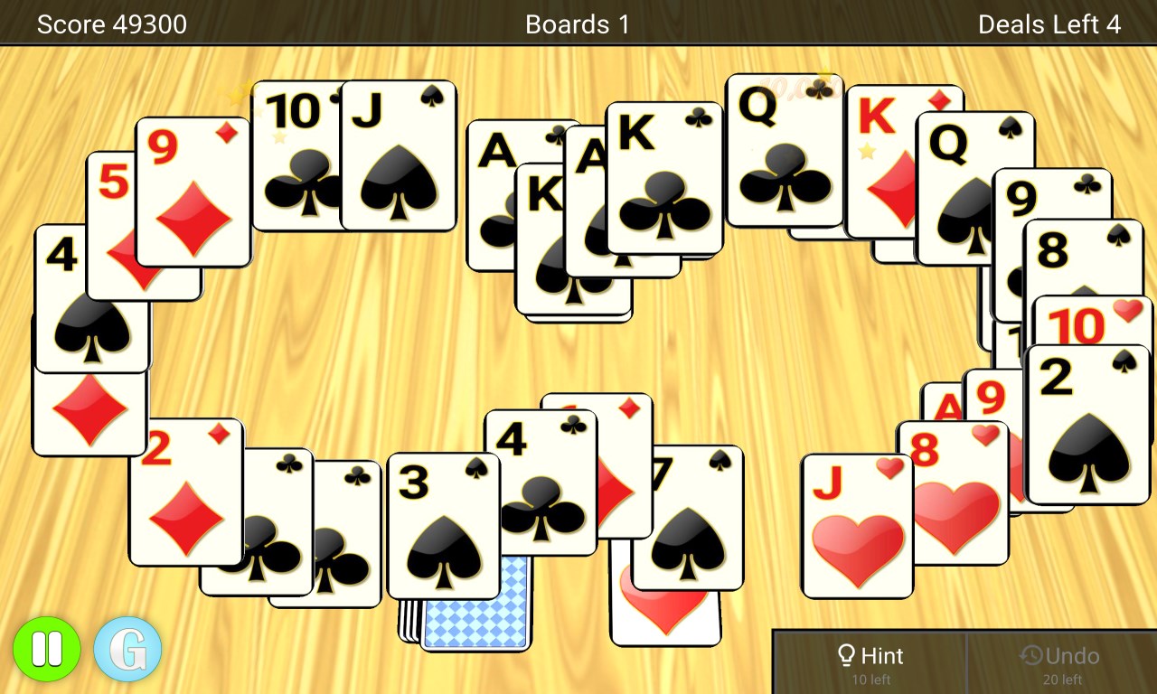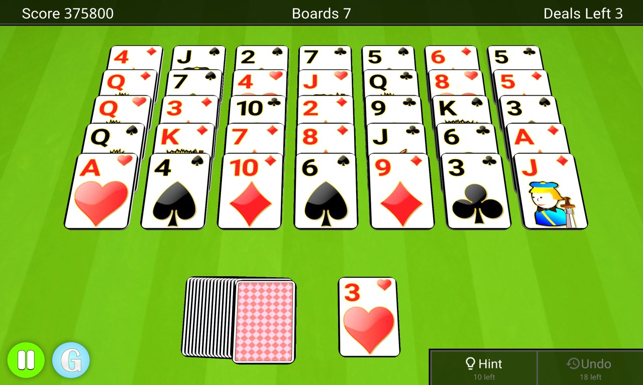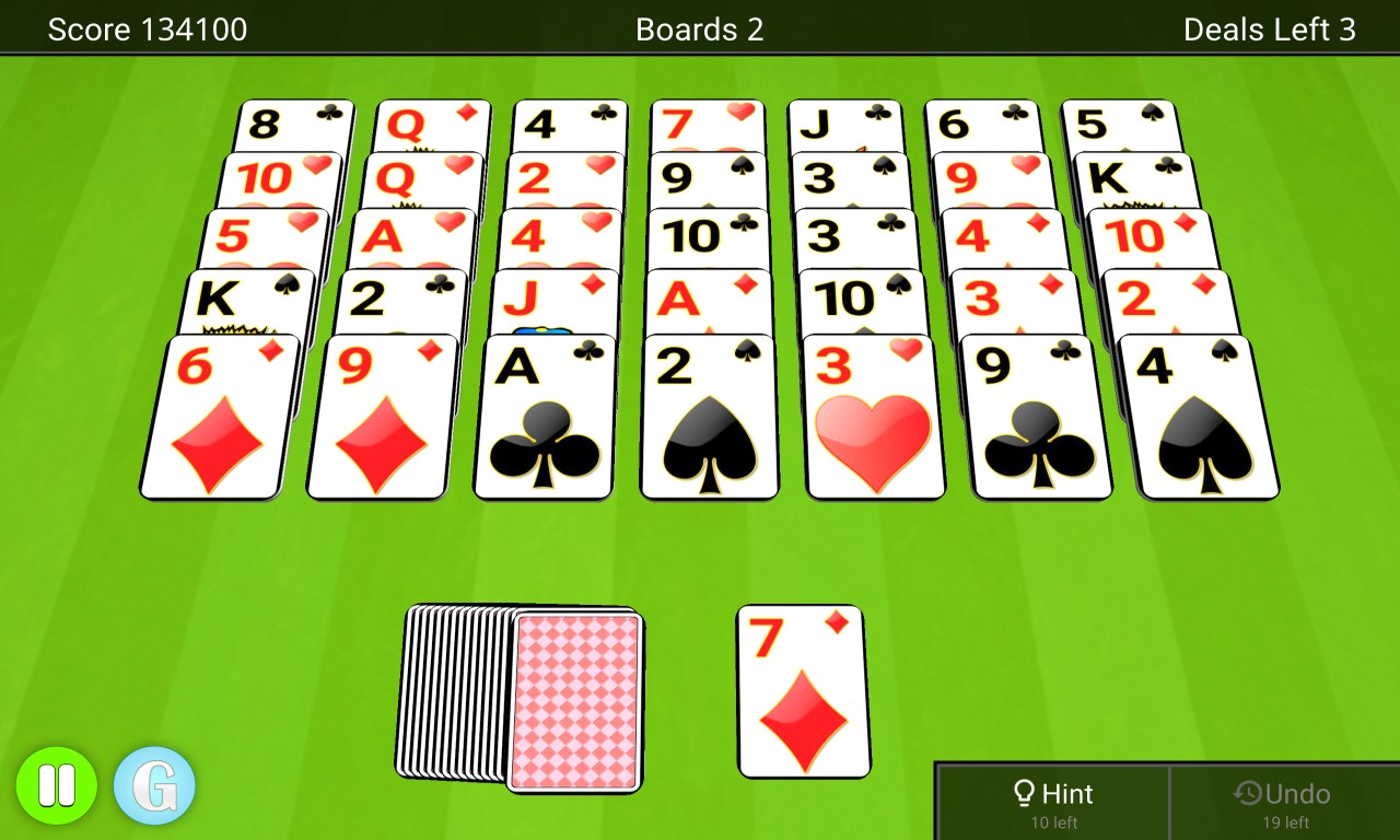 You will start with a board of 7 columns, each with 5 cards, all face up. At the bottom you will find a stack of cards and a foundation pile. The goal of the game is to clear as many boards as possible by tapping cards that are one lower or one higher than the one in the foundation pile. You can match any uncovered card from any column.