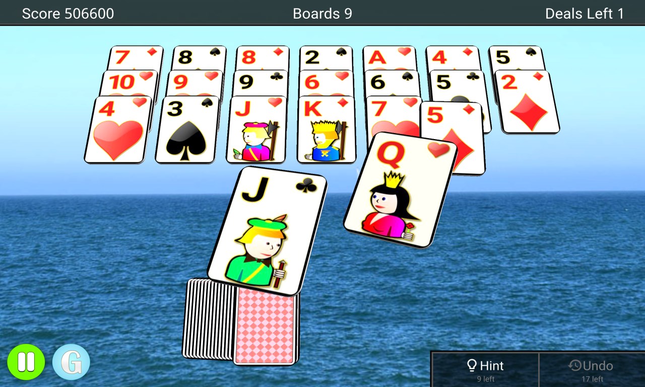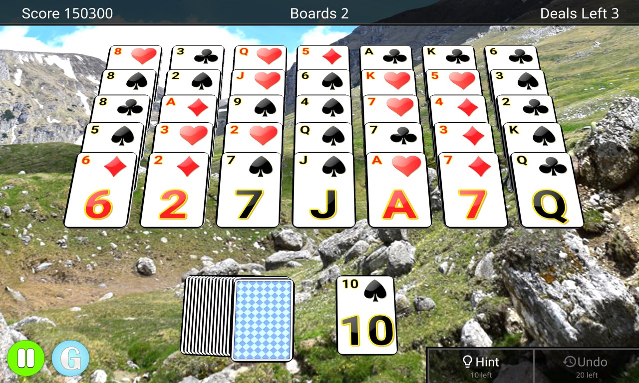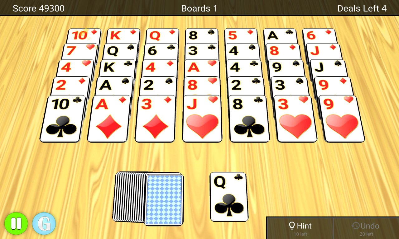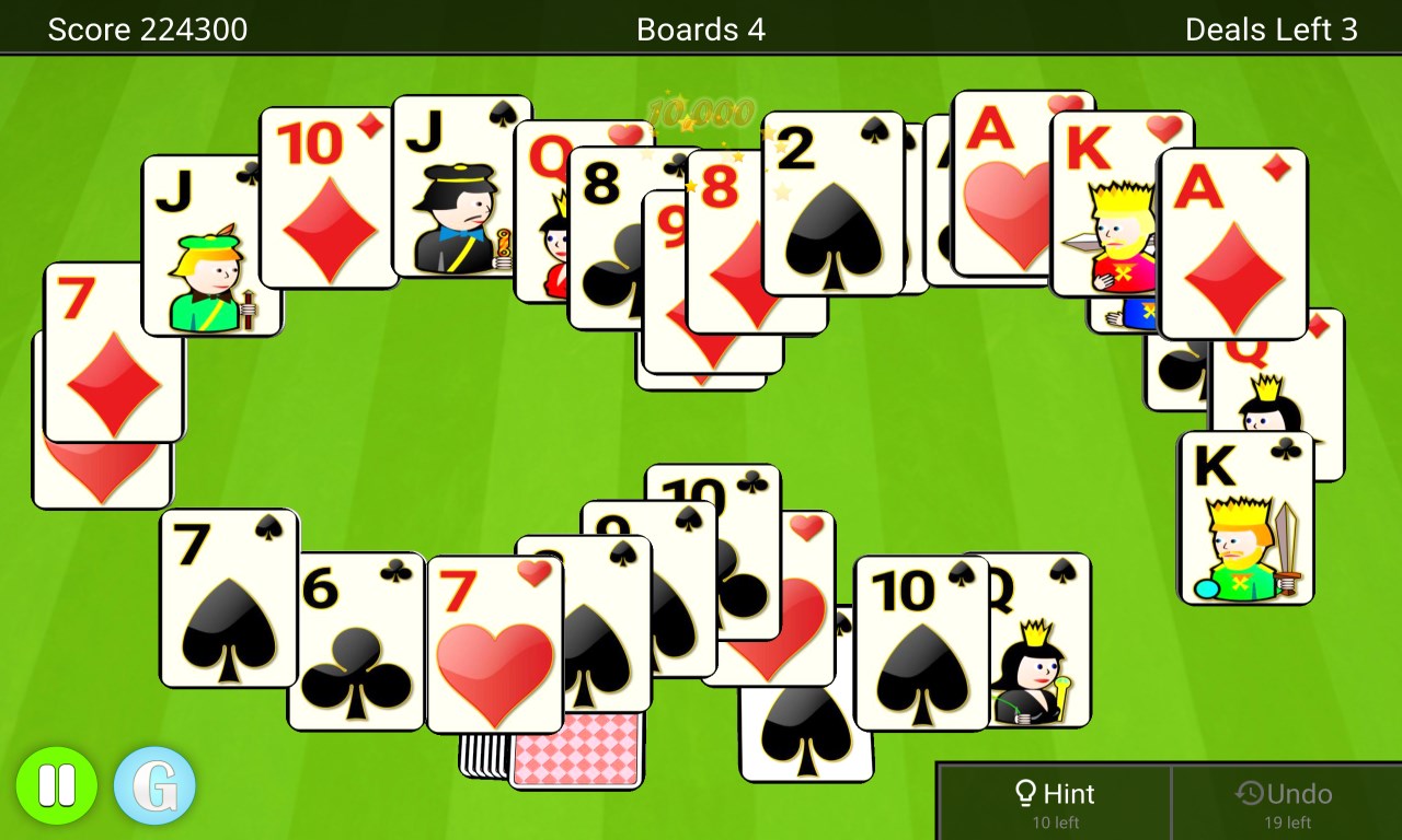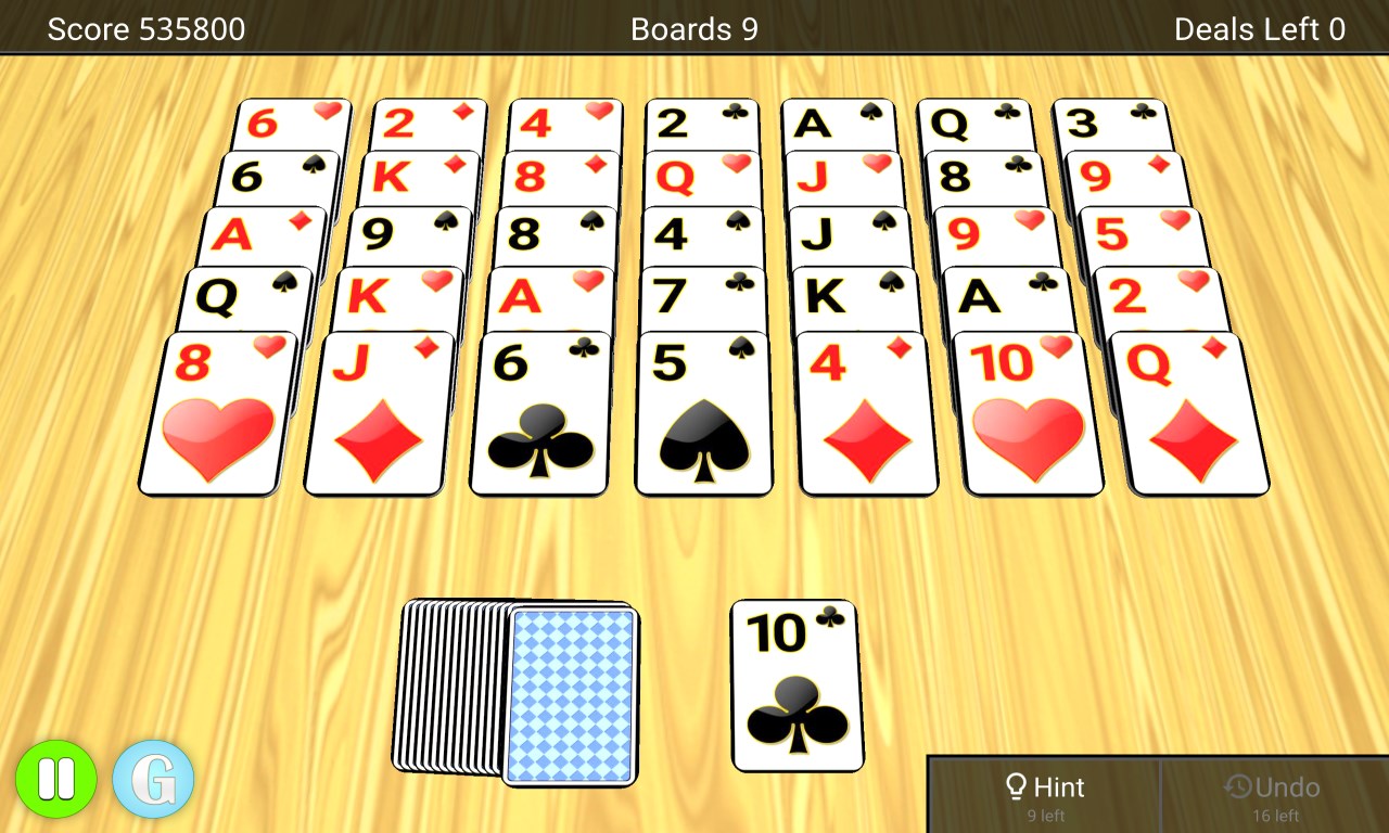 You will start with a board of 7 columns, each with 5 cards, all face up. At the bottom you will find a stack of cards and a foundation pile. The goal of the game is to clear as many boards as possible by tapping cards that are one lower or one higher than the one in the foundation pile. You can match any uncovered card from any column.