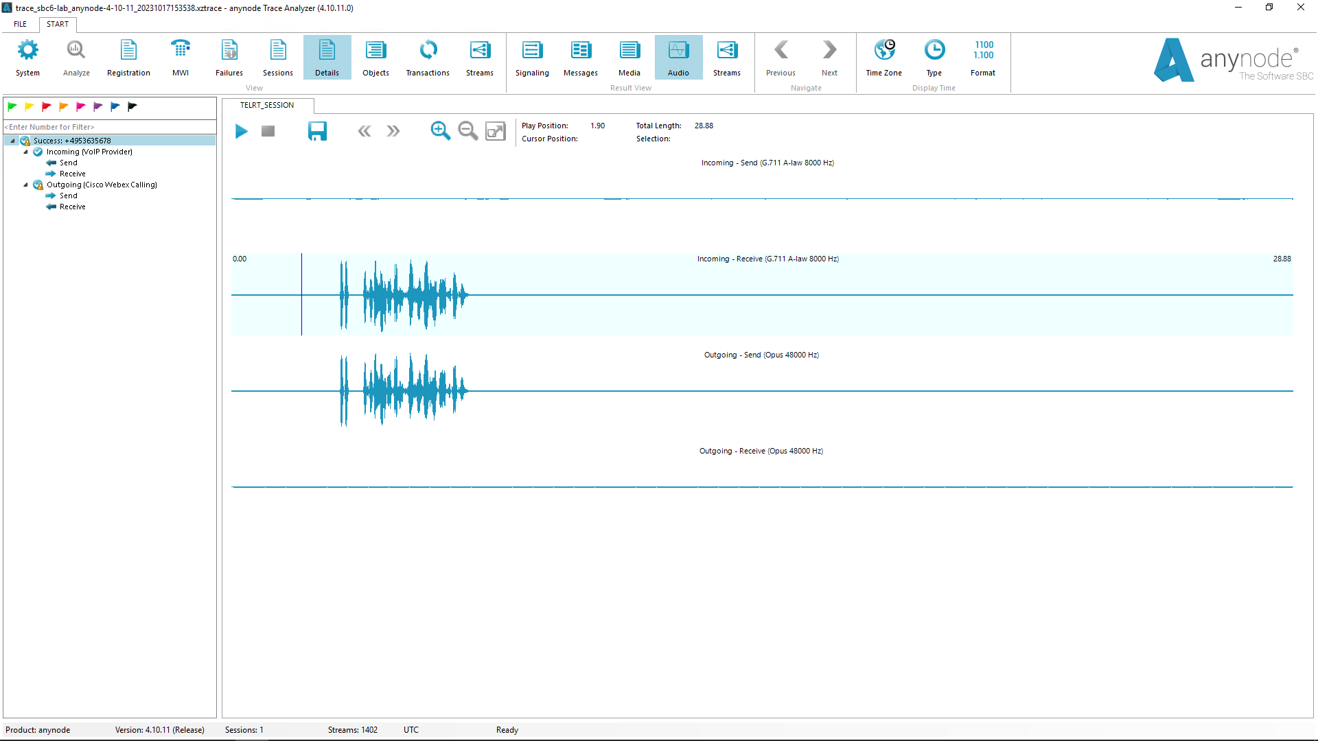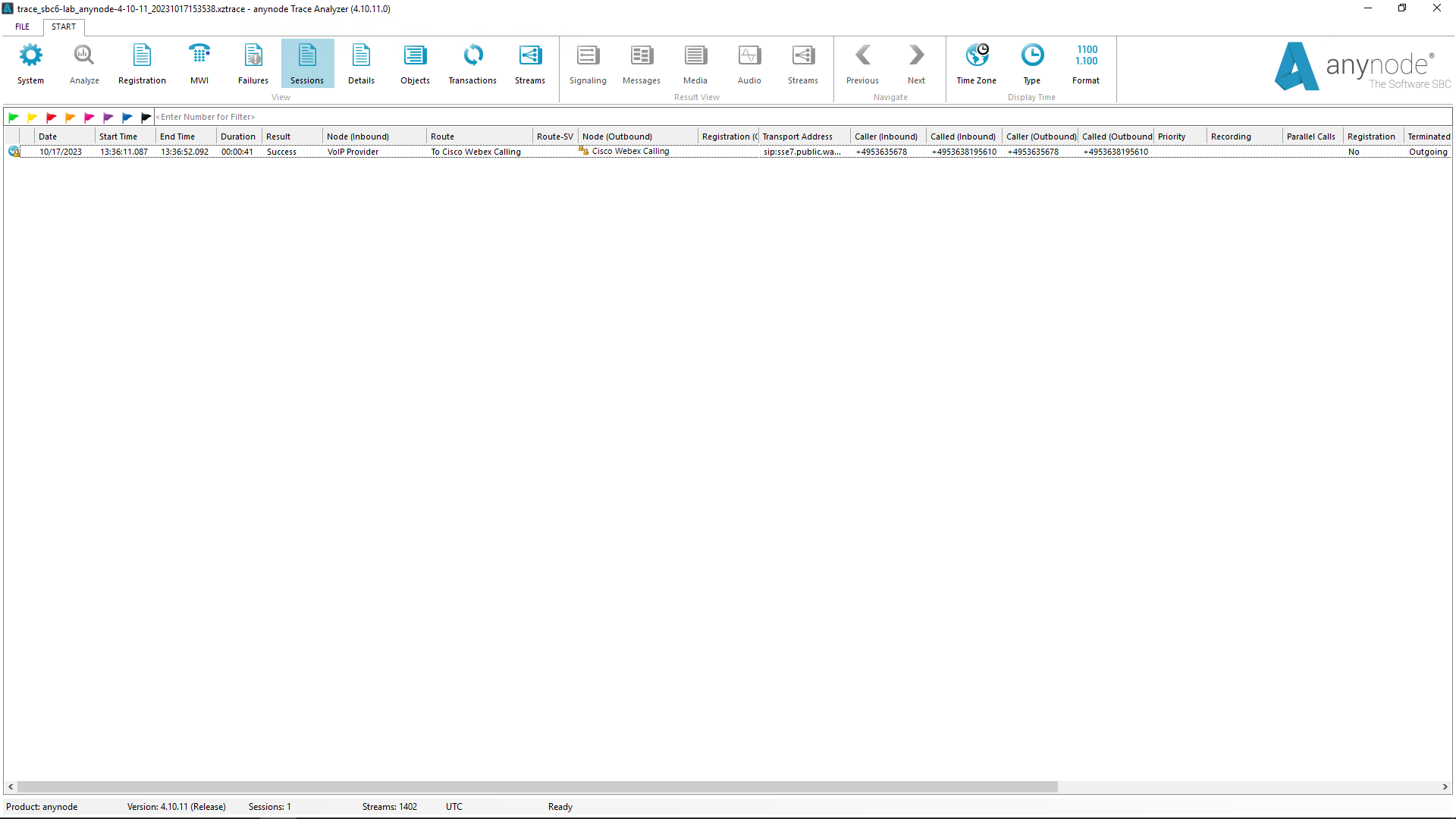 The main advantage to using the Trace Analyzer over conventional developer tools is that it is one single tool that can be, and is, used by everyone, from on-site administrators, all the way up to the core developers of anynode here at TE-SYSTEMS. You do not need to install additional software like "Wireshark". You can avoid the time-consuming search for tools suitable for debugging SIP sessions. The Trace Analyzer was developed by TE-SYSTEMS specifically for anynode. This means you easily get the data analyzed and presented that is relevant for you. We have placed a special emphasis on ease of use of our Trace Analyzer tool. (v4.10.11)