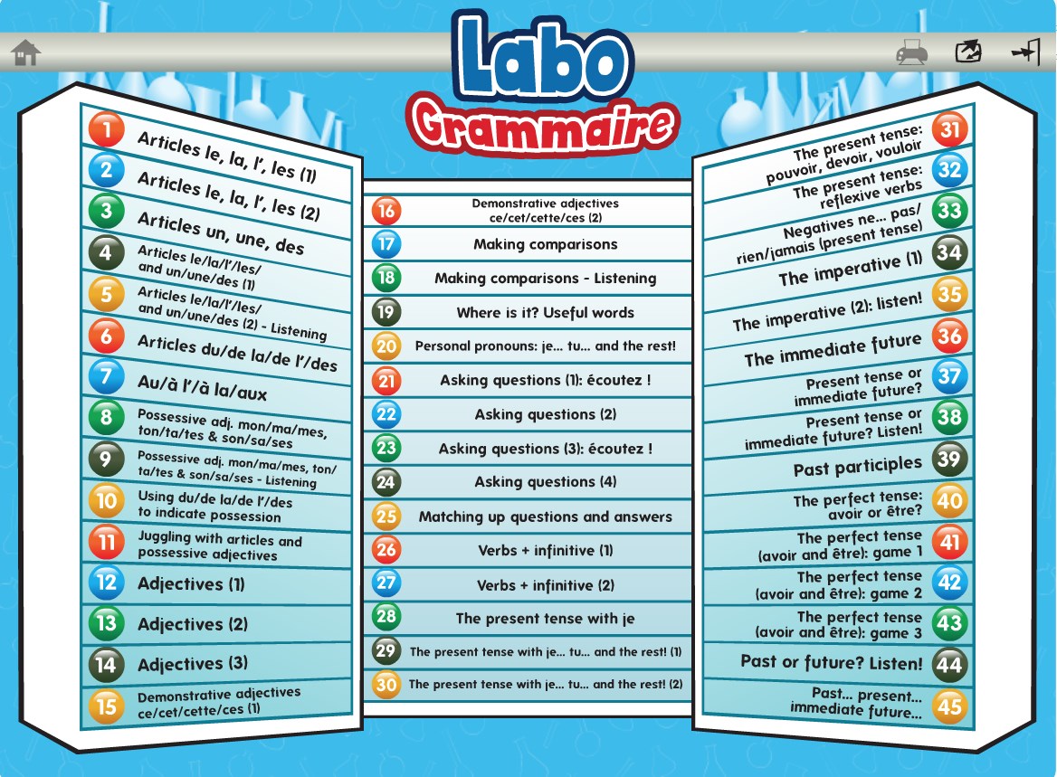 Labo Grammaire for Key Stage 3 features 45 units of interactive games to consolidate important French grammar points, each including a mini grammar lesson for reference. From the basics of articles to the perfect tense with avoir and ĂȘtre, students can practise using all parts of speech whilst enjoying the competitive activities. With an emphasis on communicative structures, Labo Grammaire will consolidate learning across the key skills through its fun approach to grammar.