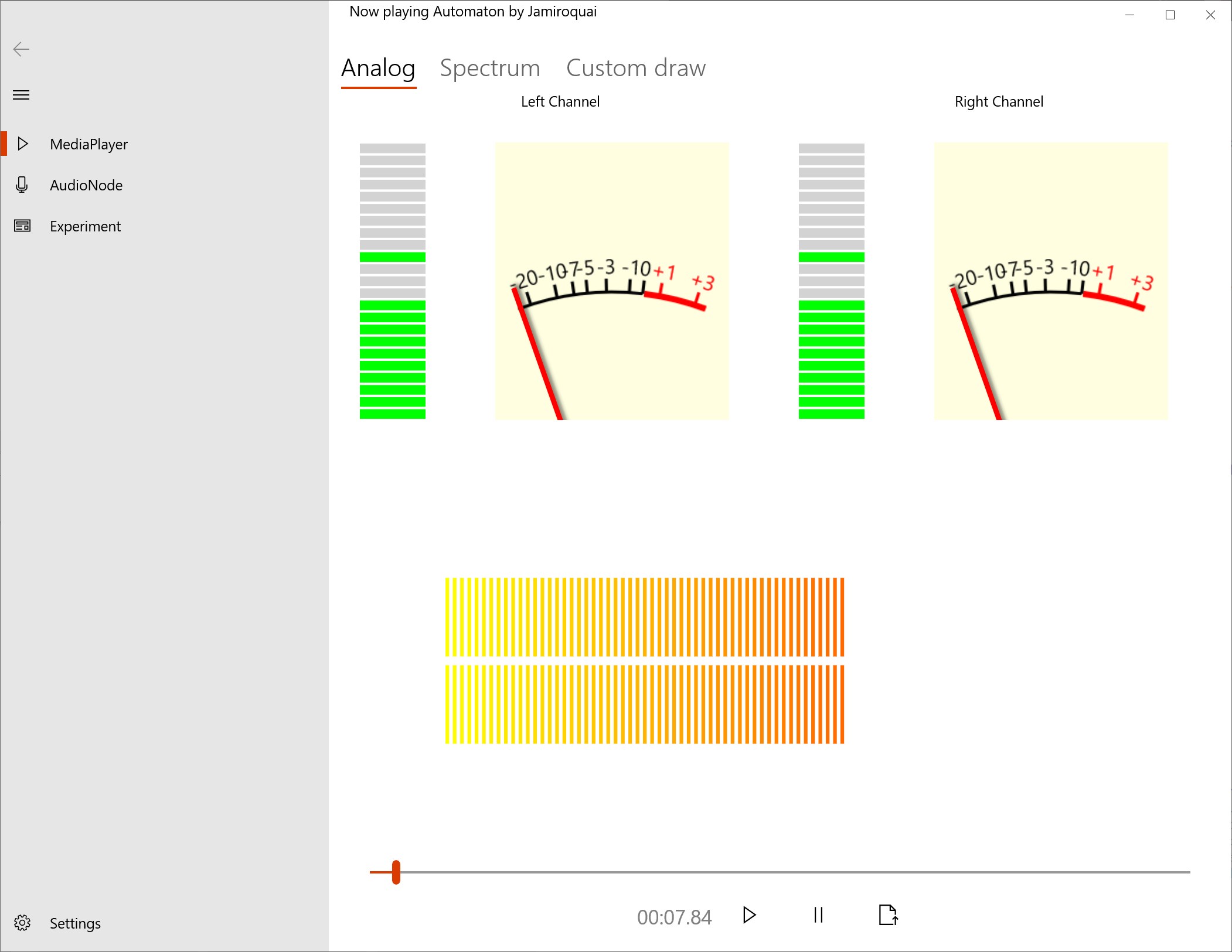 The demo app provides a simple UI that enables the opening and playback of various audio file formats showing off both the stock and custom Spectrum analyzer and VU meter controls with the graphics running smoothly at 60FPS and frame accurately in sync with the audio playback.