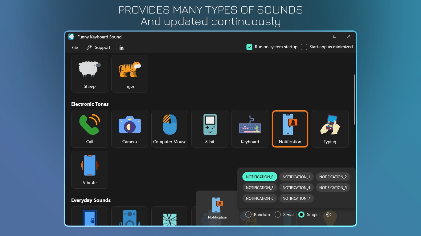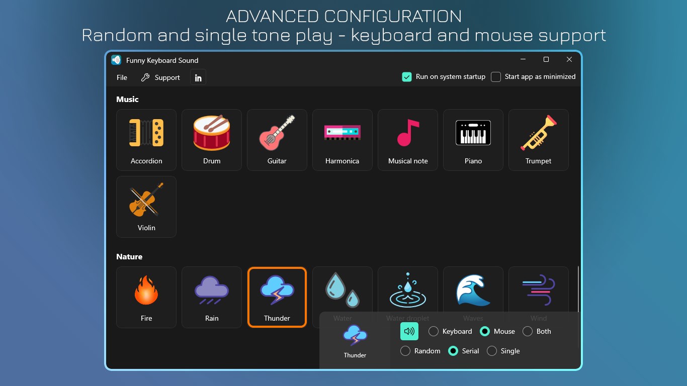 Advanced configuration: choose to play 1 sound in a specific sound type or play randomly, turn sounds on or off or combine keyboard and mouse.