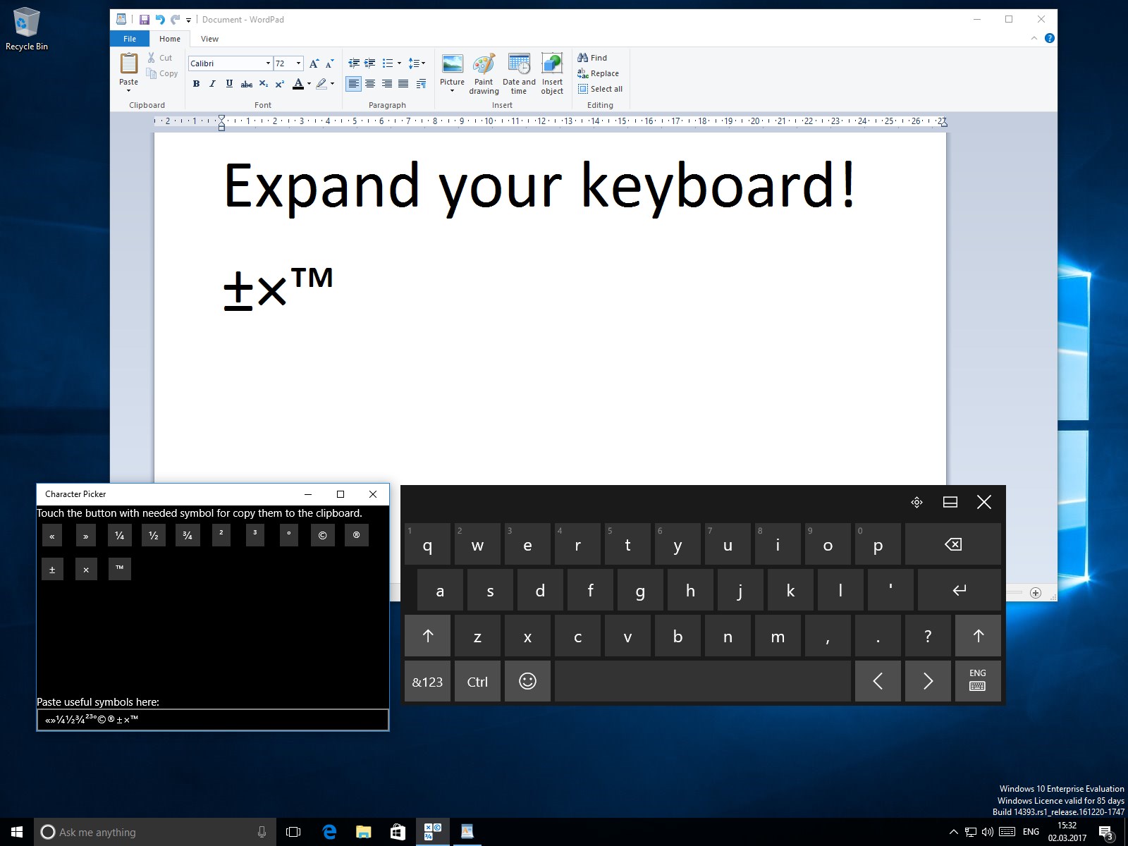 There are not some useful symbols at the keyboard. Collect special symbols (typography, math etc) from web, messages, documents for future use. Then use it in your documents. Just touch/click needed character for copy it to the clipboard.