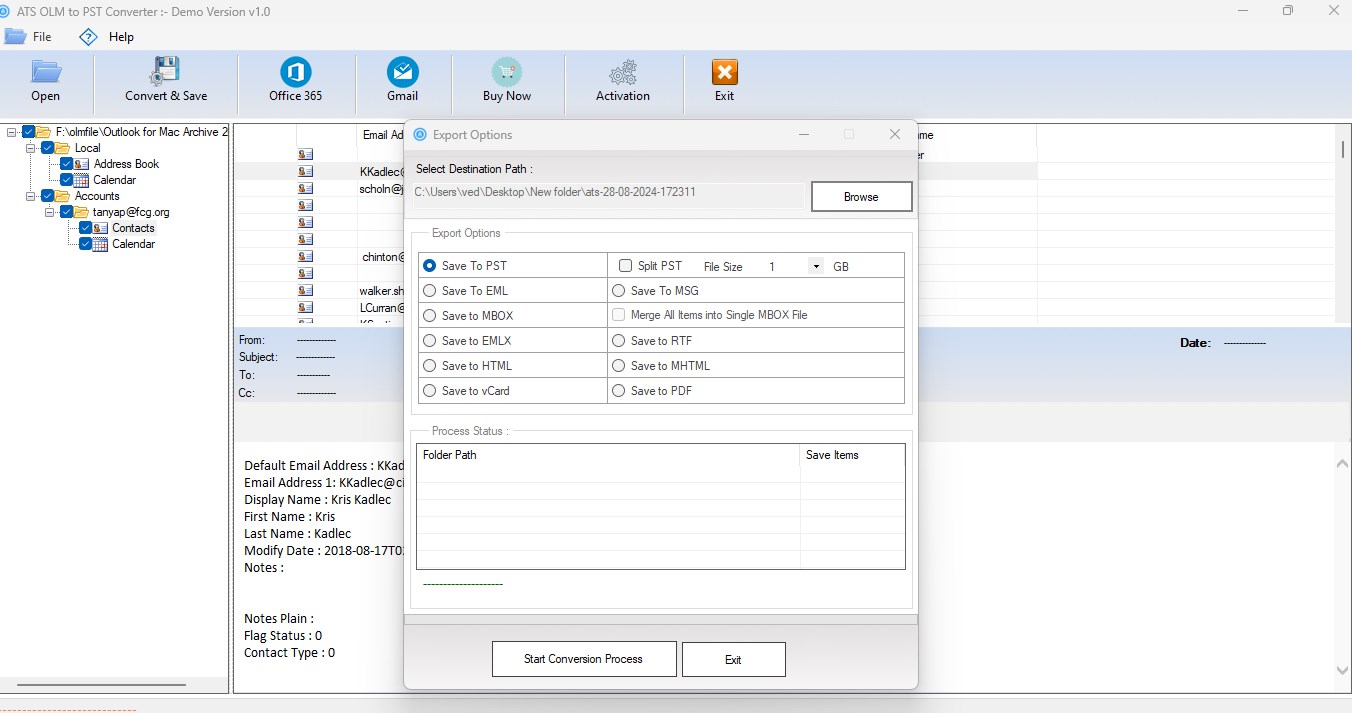 Limitation : Demo Version Show all message preview and save 30 Items for each selected folder.