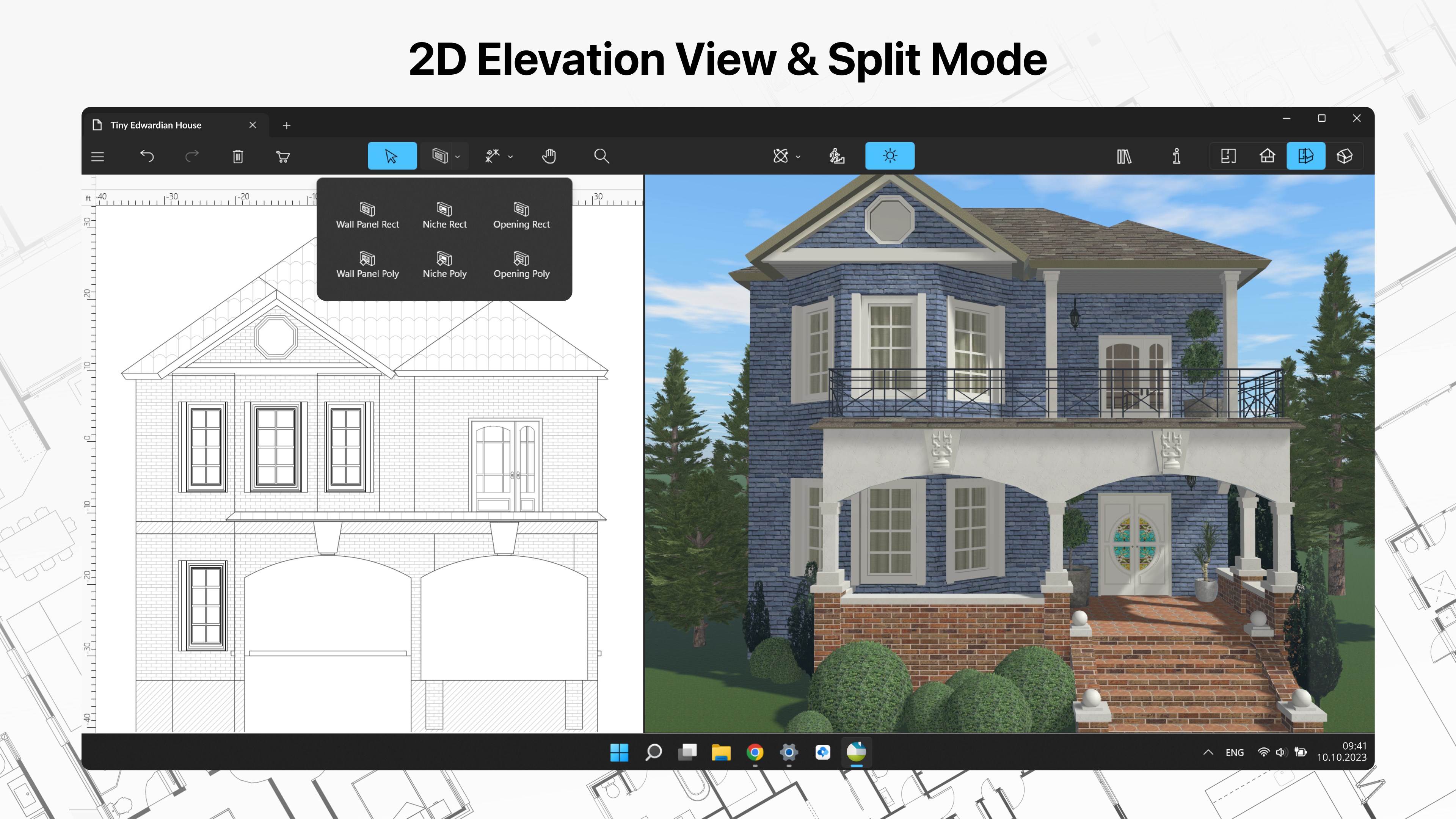 • Work in 2D Elevation view that displays the side view on walls and roof, a perfect tool for working with openings, niches and wall panels;