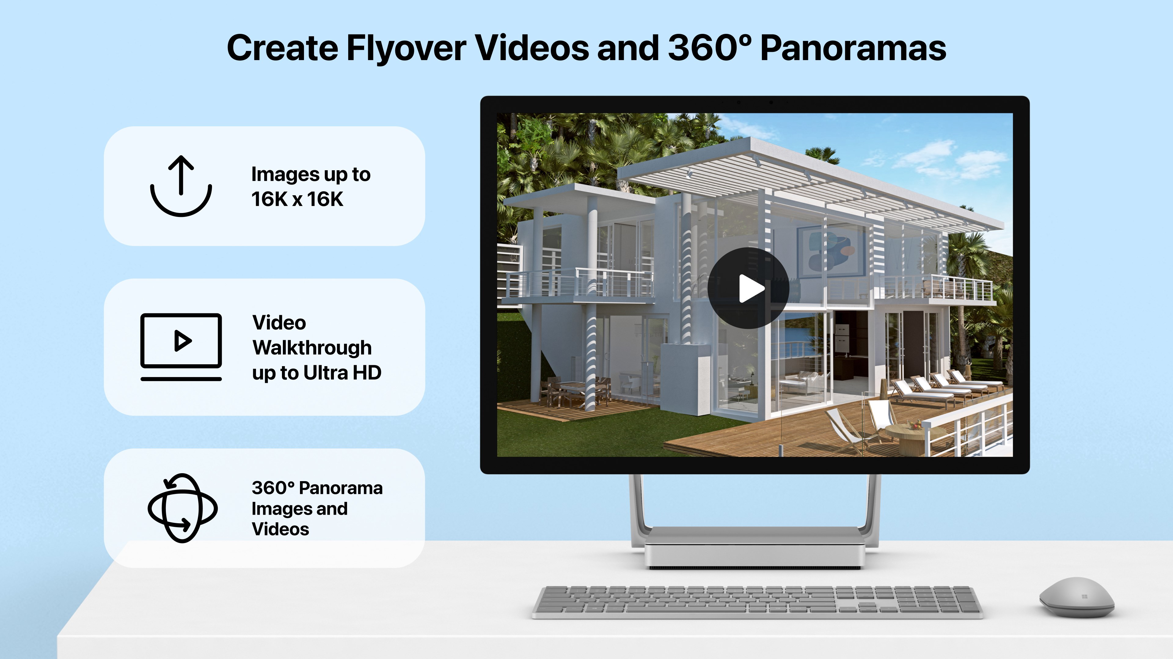 • Render realistic home interior and outdoor walkthrough videos with export quality up to Ultra HD;