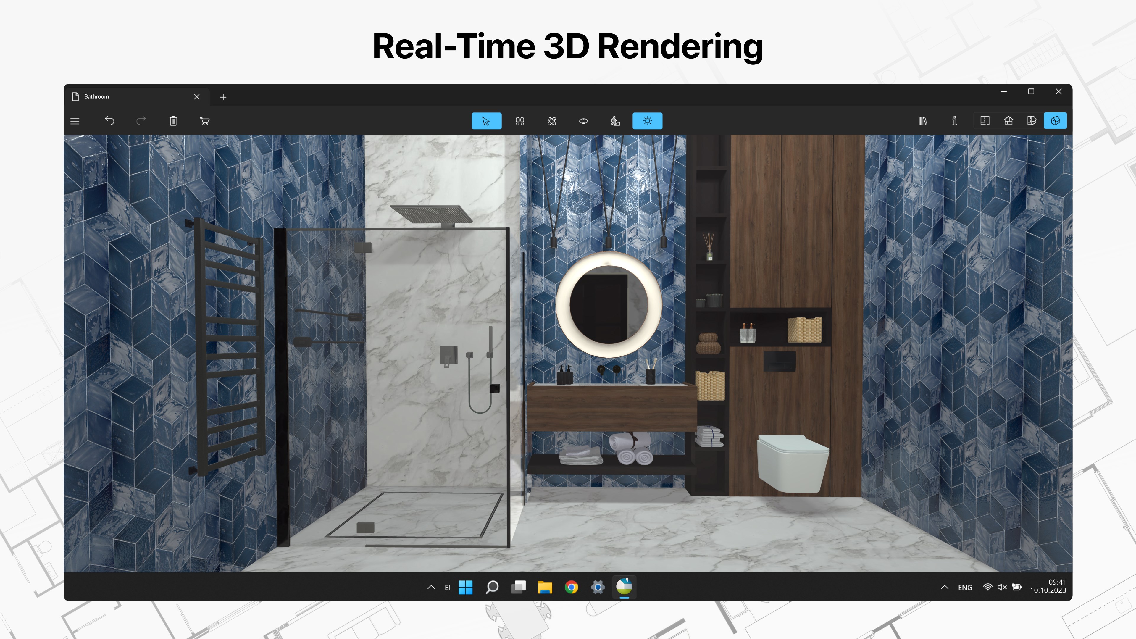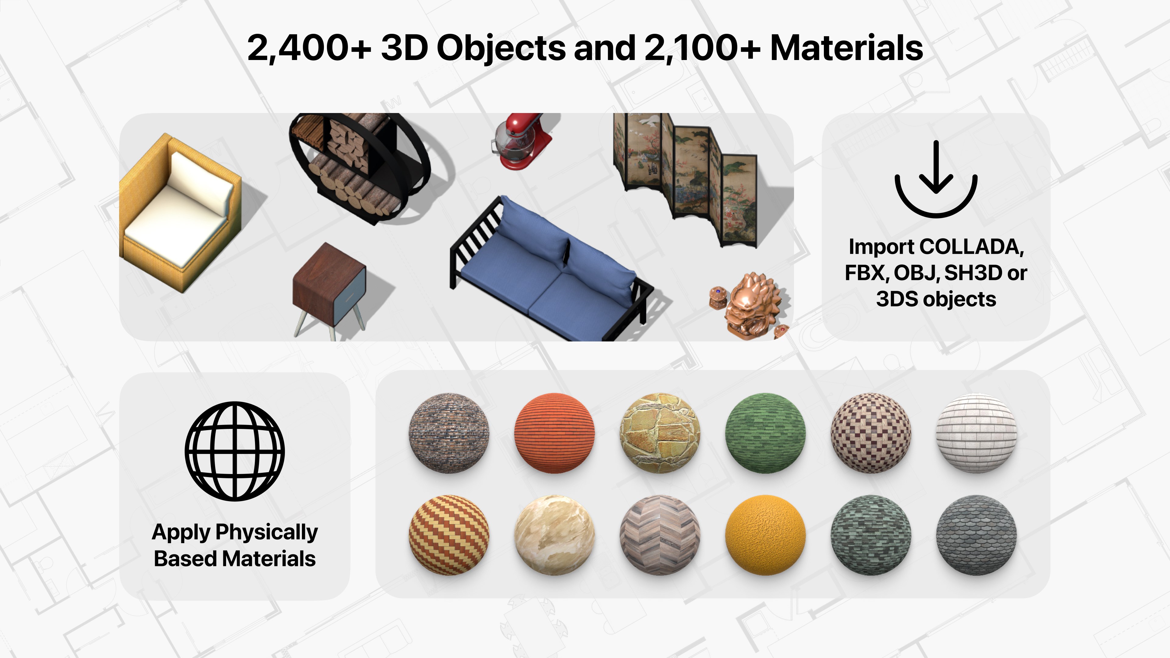 • Add and move furniture and other objects (2,400+ items), and apply physically based materials (2,100+ supplied materials);