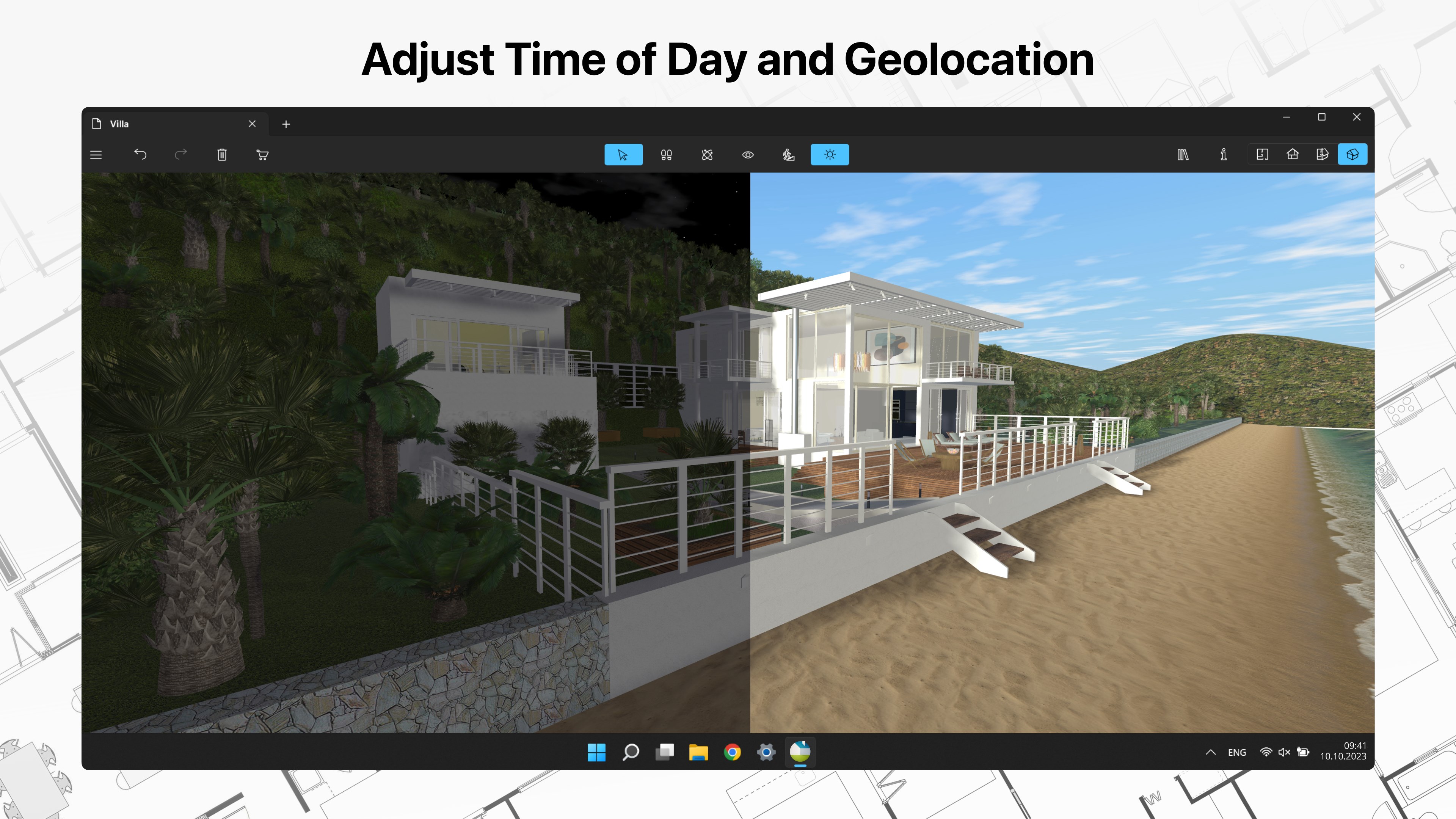 • Achieve natural lighting by setting up true geolocation, time of day and cloudiness;