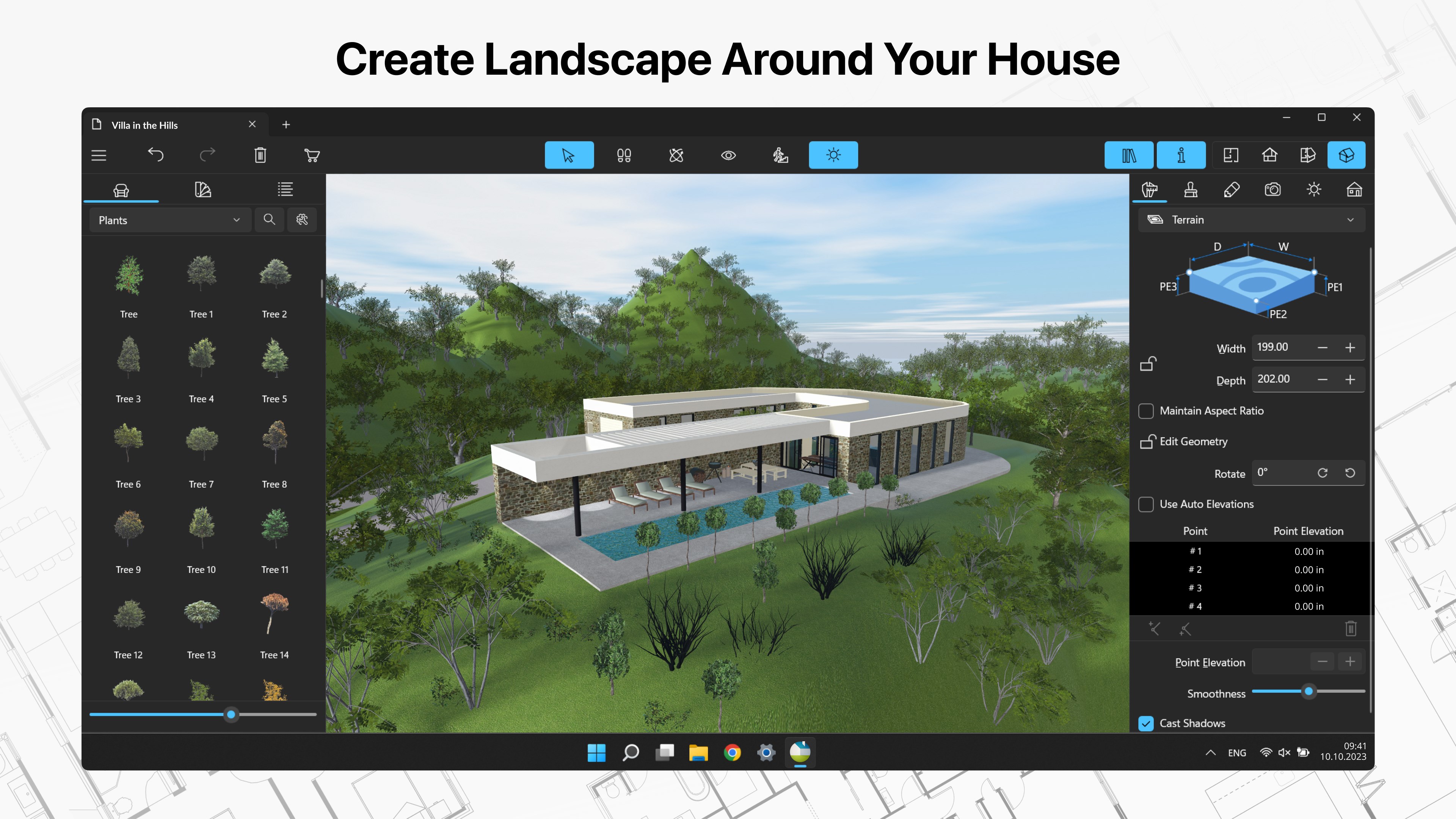 • Create elaborate terrain with elevation lines and pits, lay driveways and plan out your garden or backyard;