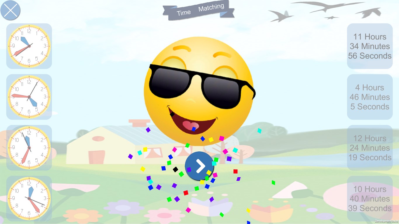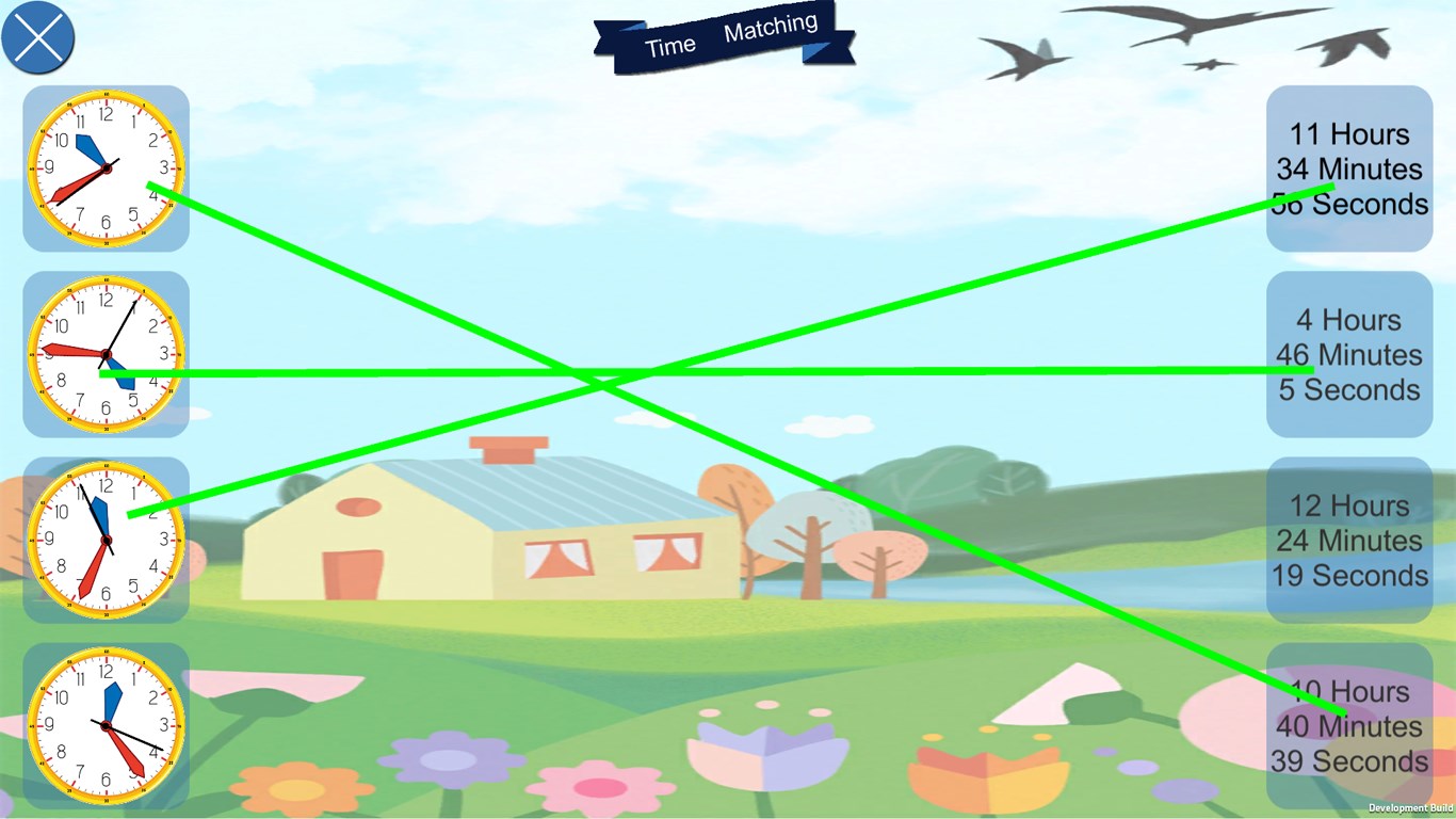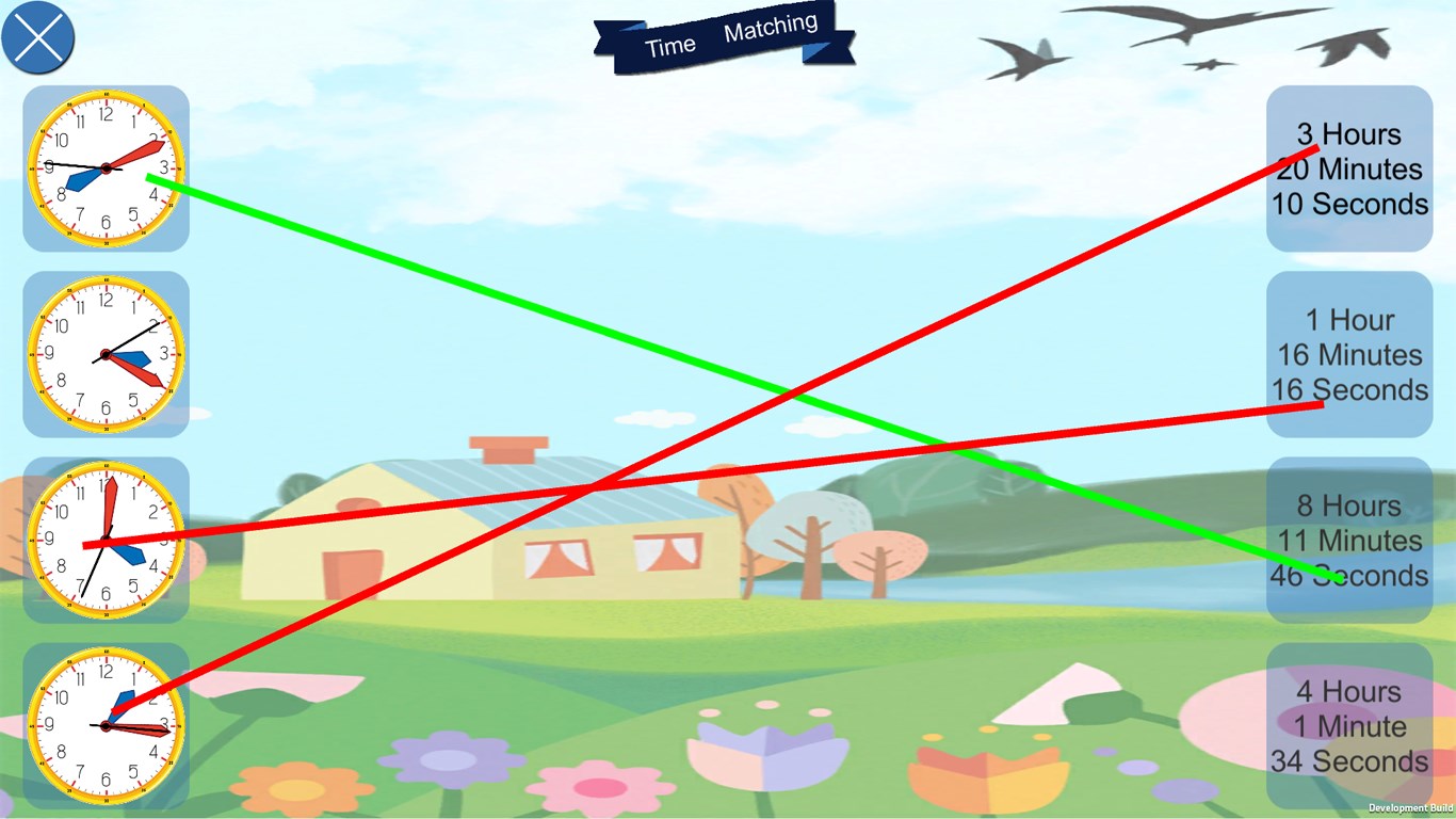 Kids can match time with clock and complete the level. There are four clocks given against its time and they need to match clock and its time correctly to go ahead. It shows green and red color line to identify correct and wrong answer respectively.