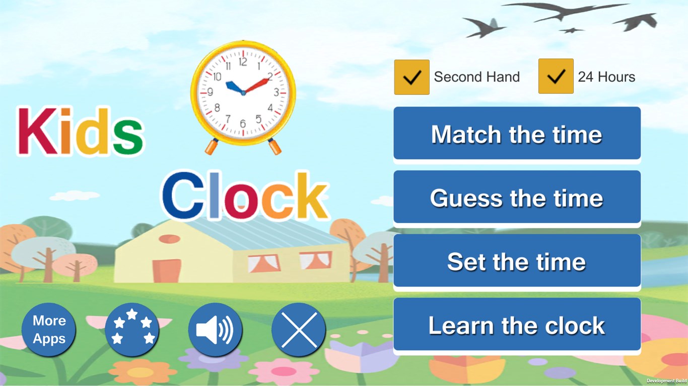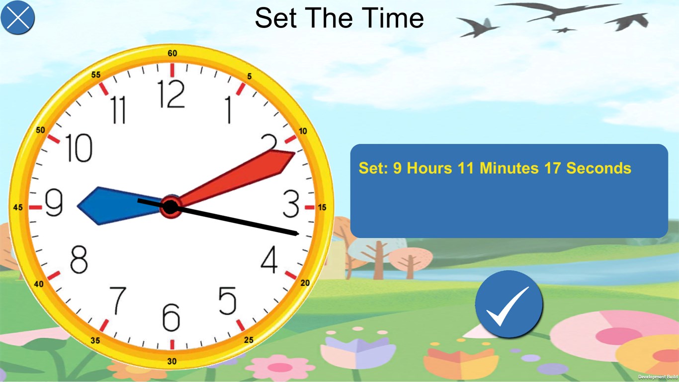 Learn clock by guessing time.Learn clock by setting time.Learn clock by matching time.Option to show and hide second hand.Option to set clock to 24 hour.Touch and move the hands to set time.
