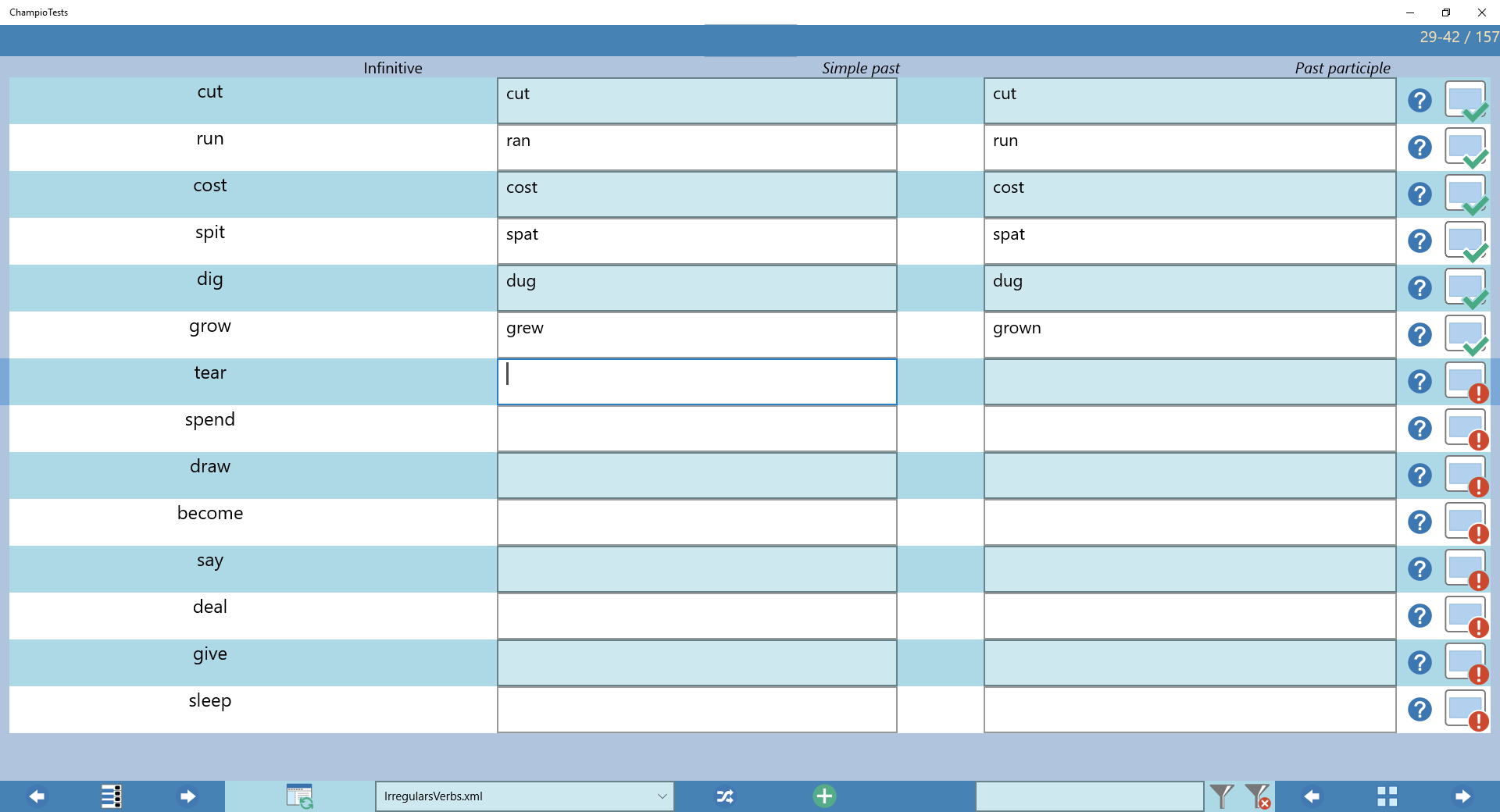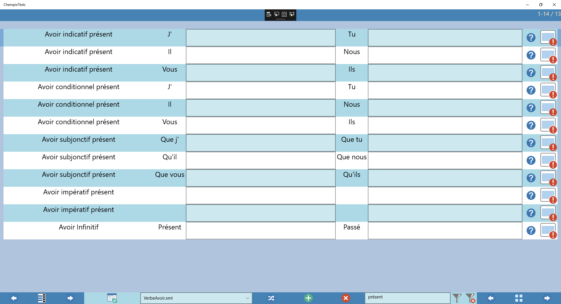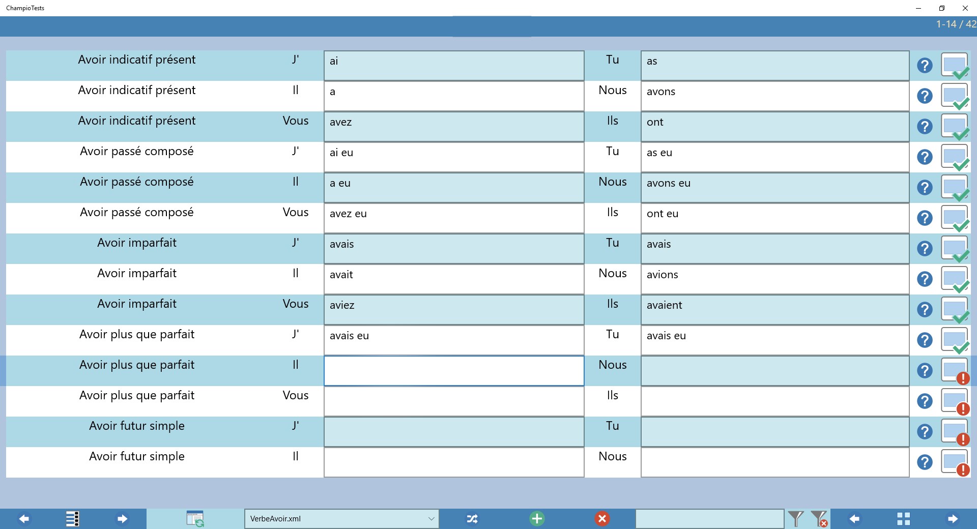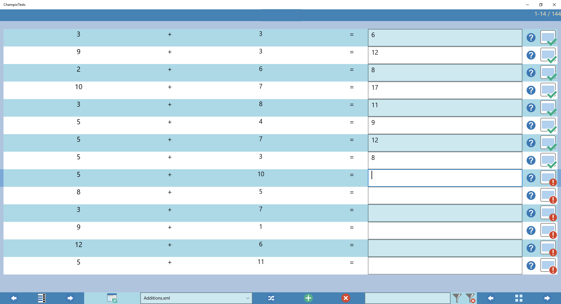 ChampioTest permet de faire des tests personnalisés pour vos enfants. Ils pourront ainsi pratiquer les tests que vous aurez préparé pour eux. Que ce soit des tests de verbes en français ou en anglais et même des mathématiques ChampioTest peut les présenter à l’écran. Lorsque la réponse est bonne il y a une icône avec un crochet vert pour indiquer que la réponse est correcte. Sur le clic de l’icone ? la réponse sera donnée. Un filtre est possible et les questions peuvent être posées dans l’ordre ou aléatoirement.