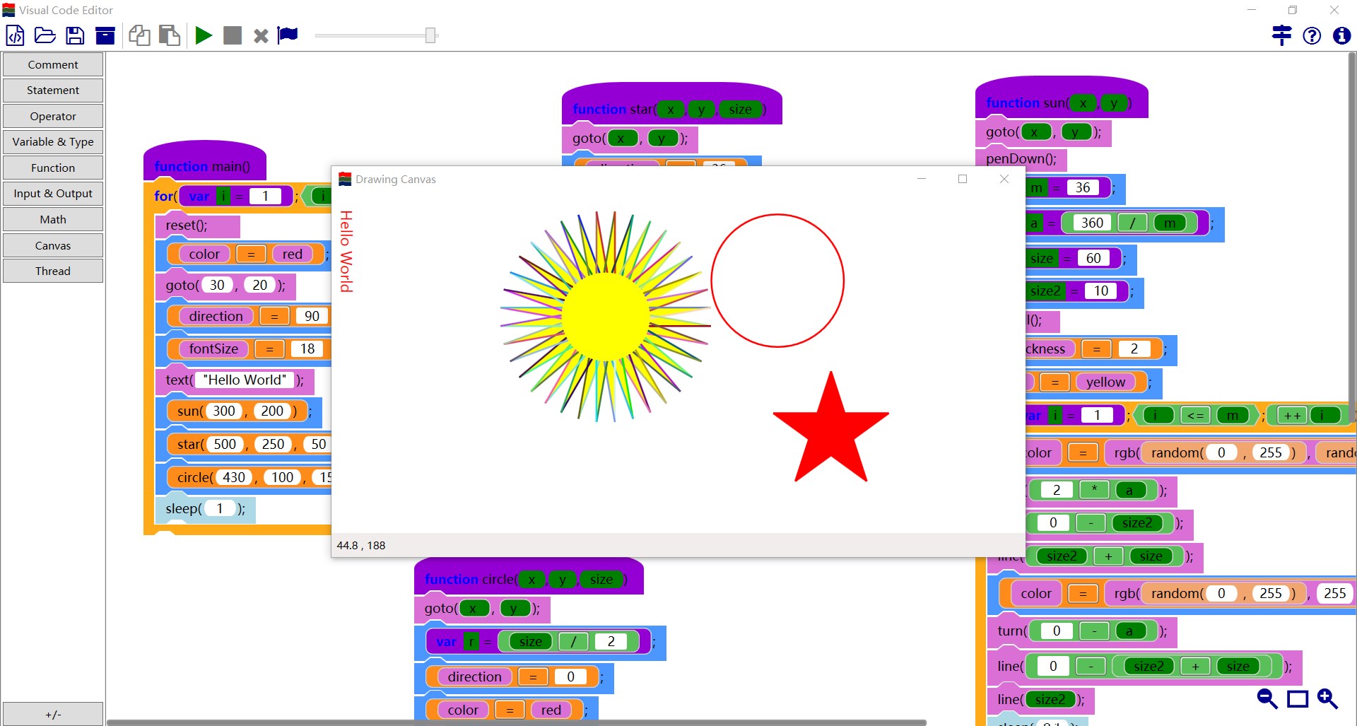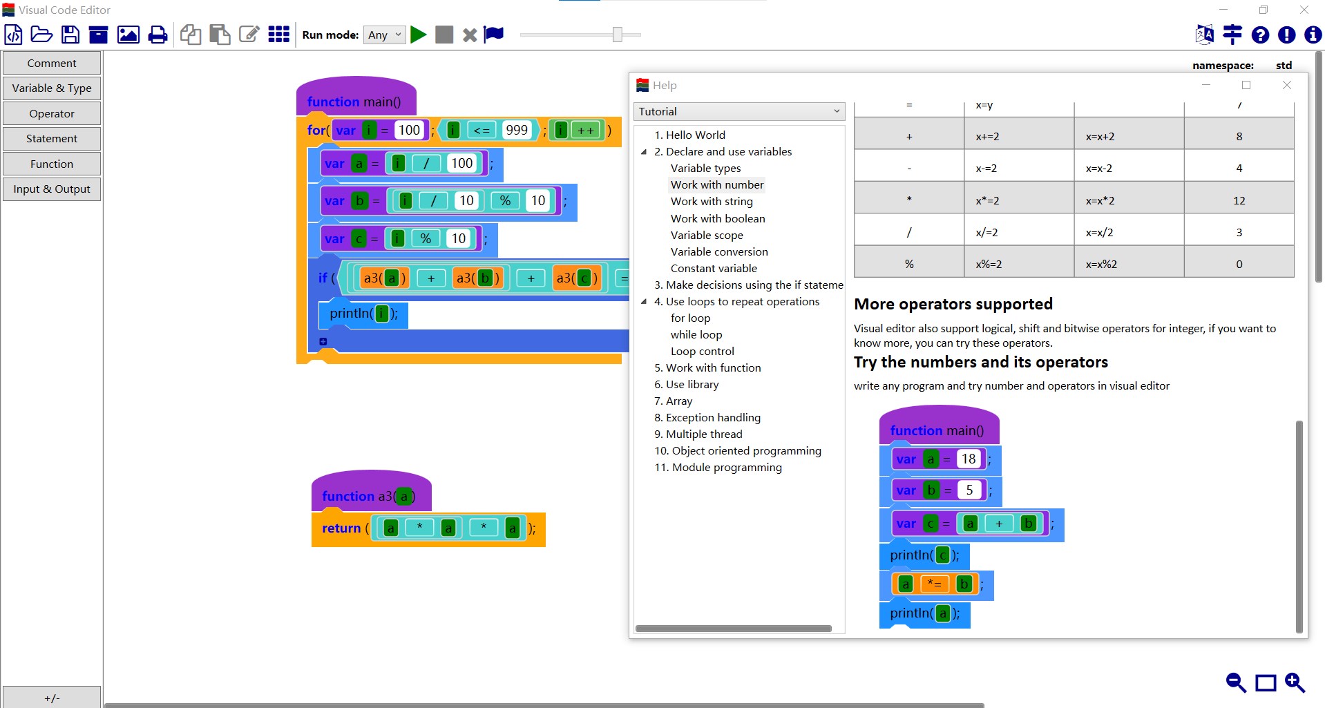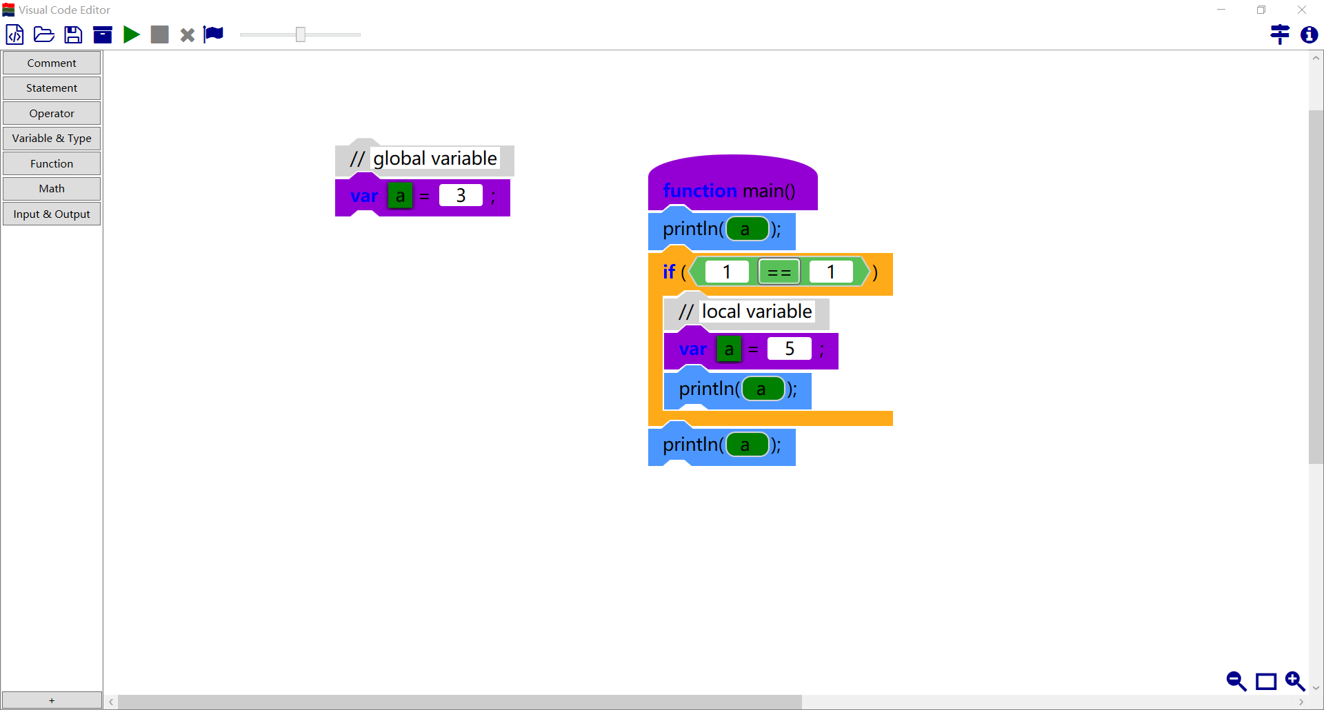 With Simply drag and drop, you can do the programming or coding. This editor has almost all the feature of real code, and you can learn all the basic coding knowledge, including variable, variable scope, type, function, loop, logic, operator... This editor can also display the execution step and value, which can help you understanding your code running and debuging. With the visual code programming, you can avoid the boring wrong format error of real code, and pay all your attension to the programming knowledge. This tool can help you transfer to real code easily.