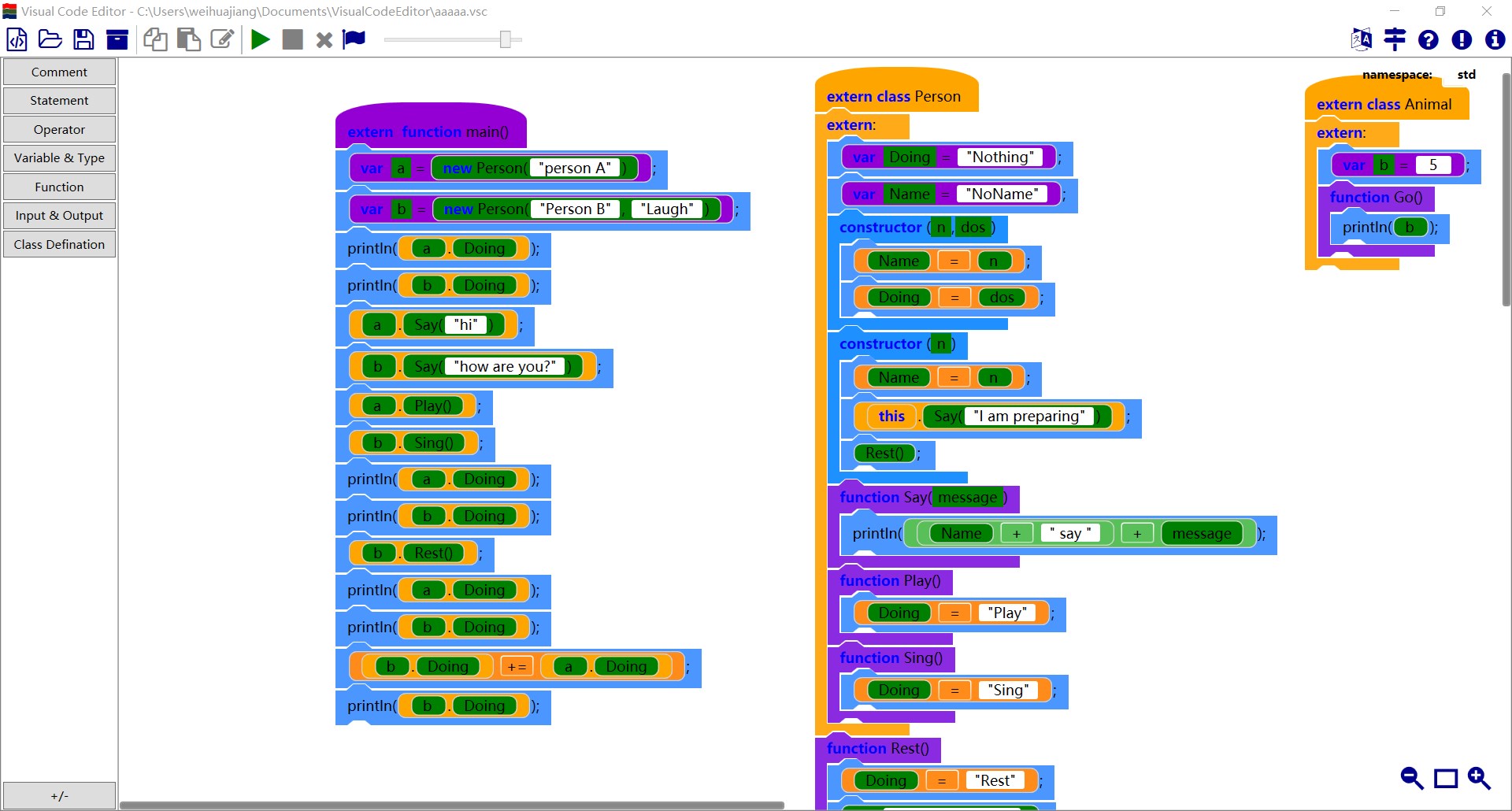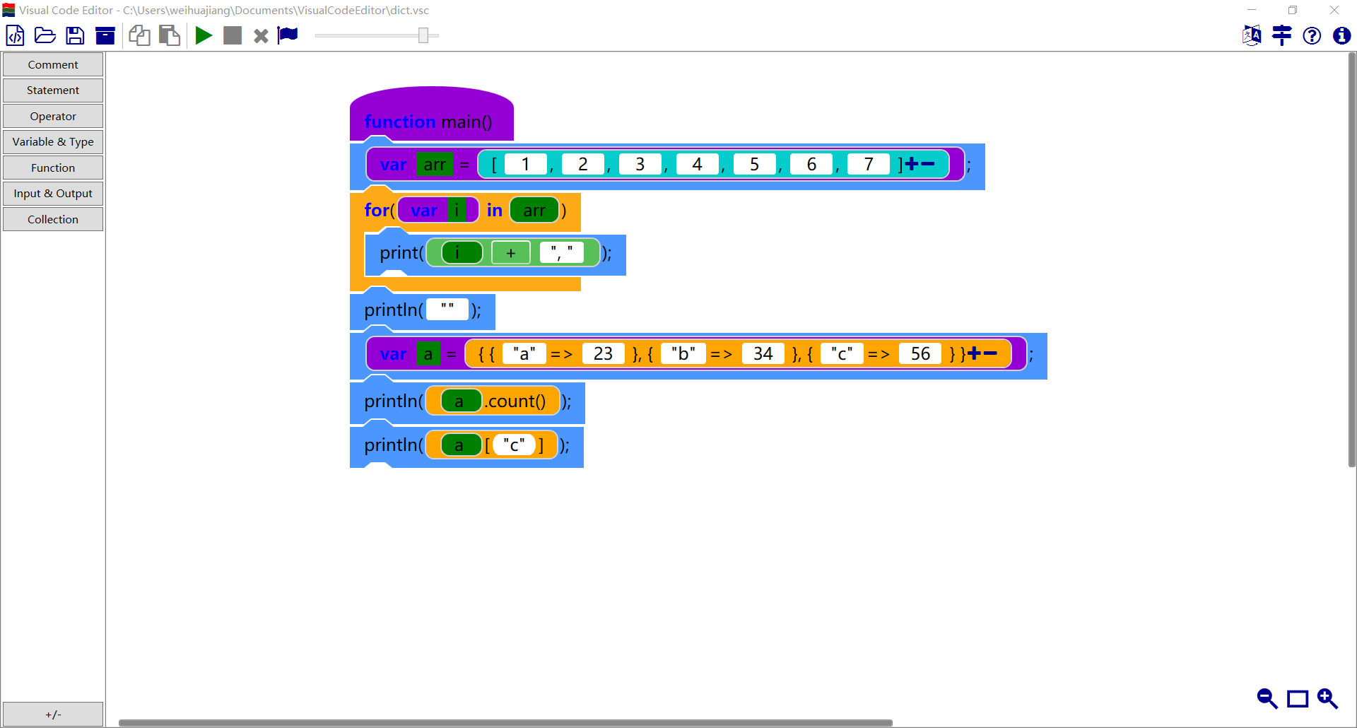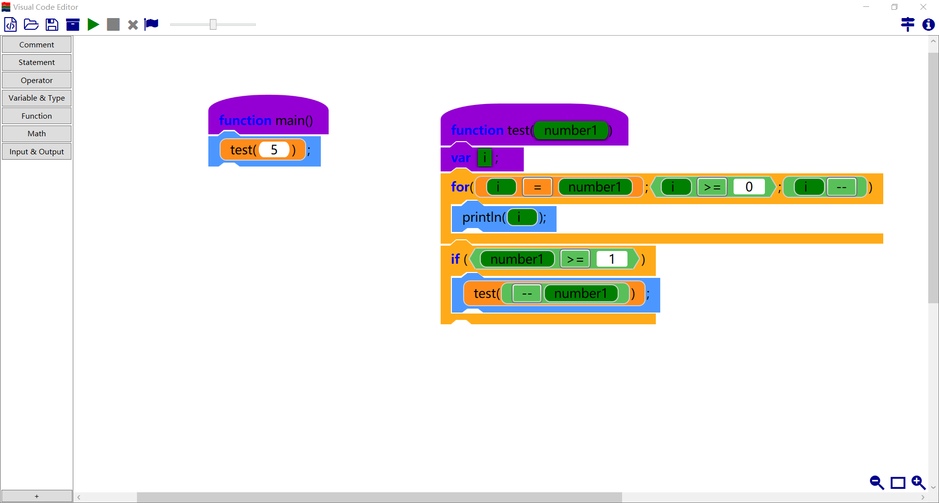 With Simply drag and drop, you can do the programming or coding. This editor has almost all the feature of real code, and you can learn all the basic coding knowledge, including variable, variable scope, type, function, loop, logic, operator... This editor can also display the execution step and value, which can help you understanding your code running and debuging. With the visual code programming, you can avoid the boring wrong format error of real code, and pay all your attension to the programming knowledge. This tool can help you transfer to real code easily.