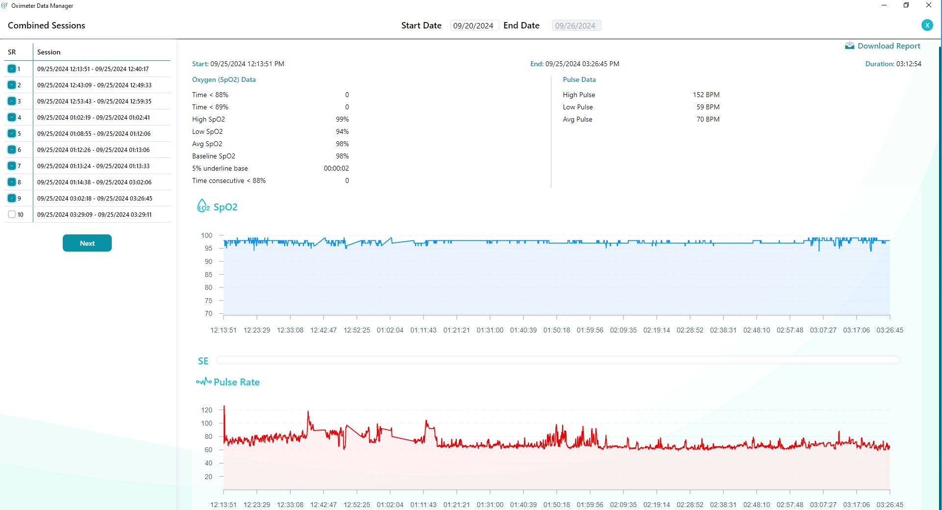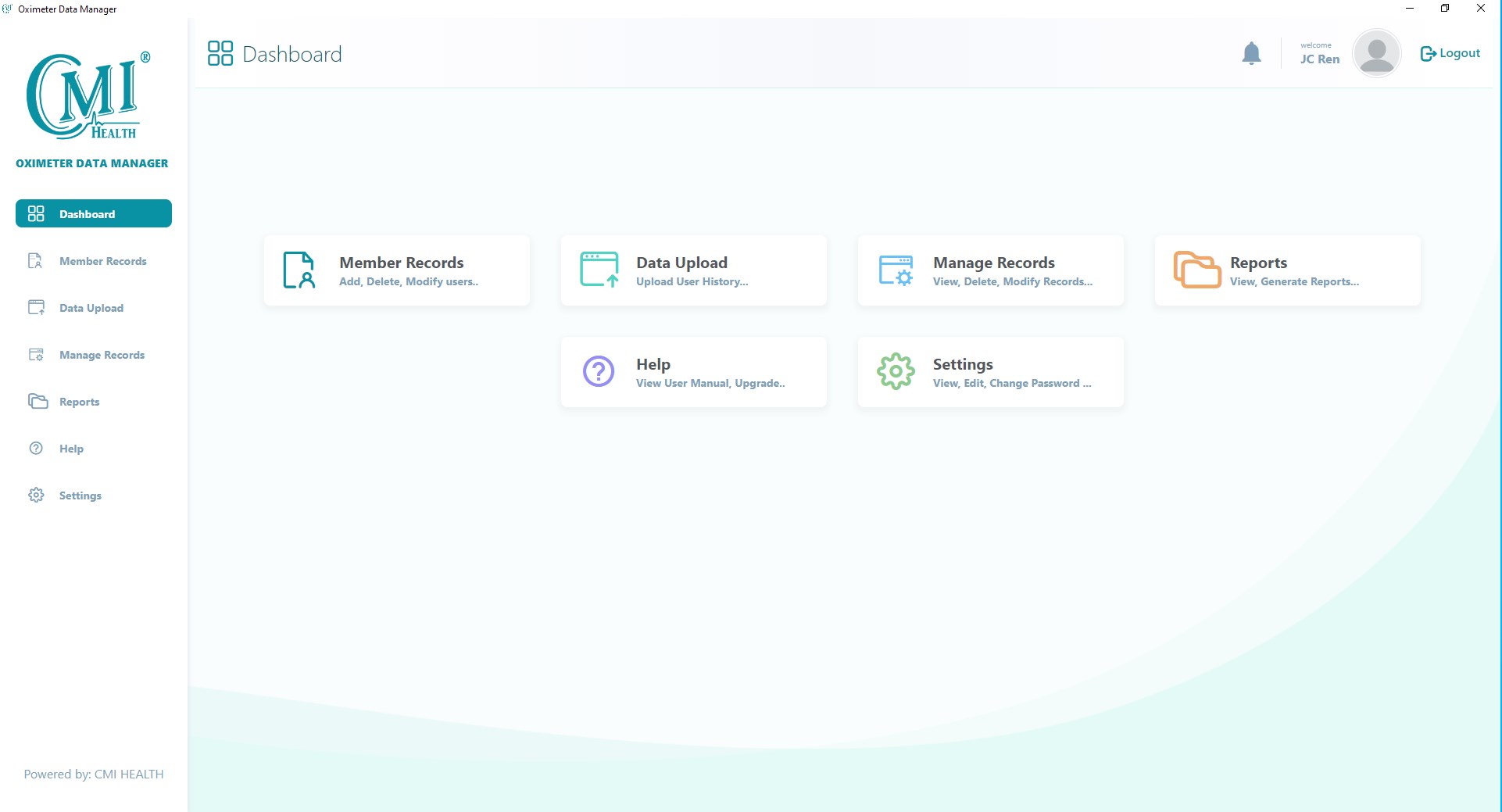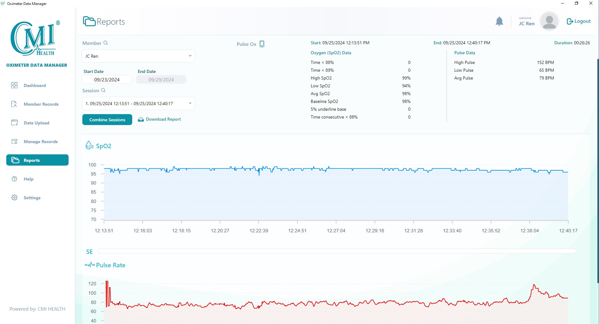 Download data from CMI Health CH-100 handheld oximeterManage users and recordsCombine records and generate PDF reports