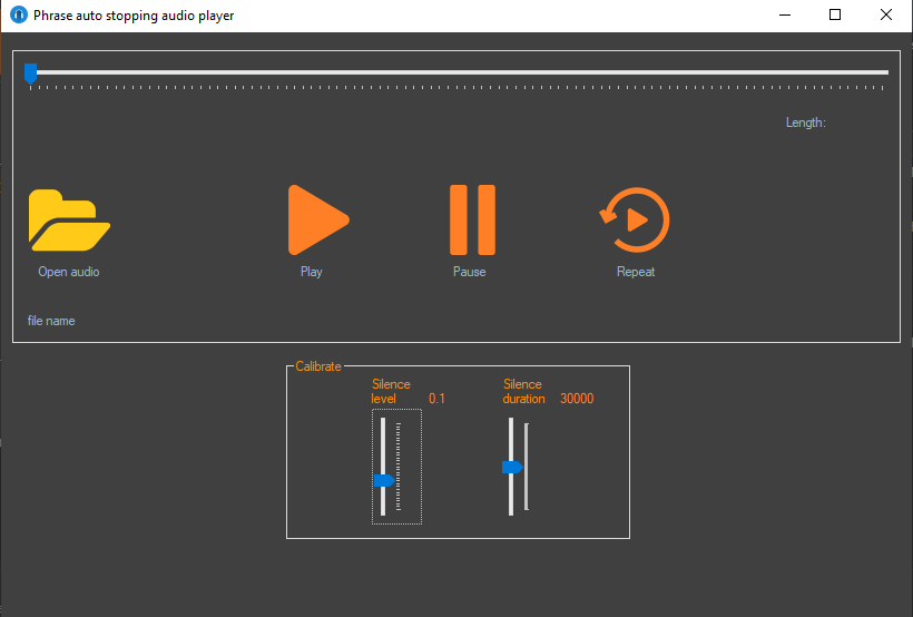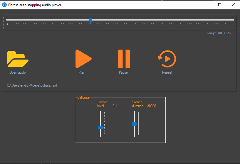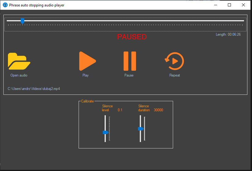 The program plays voice audio and pauses the playback on every phrase. It can repeat last phrase or continue the playback.