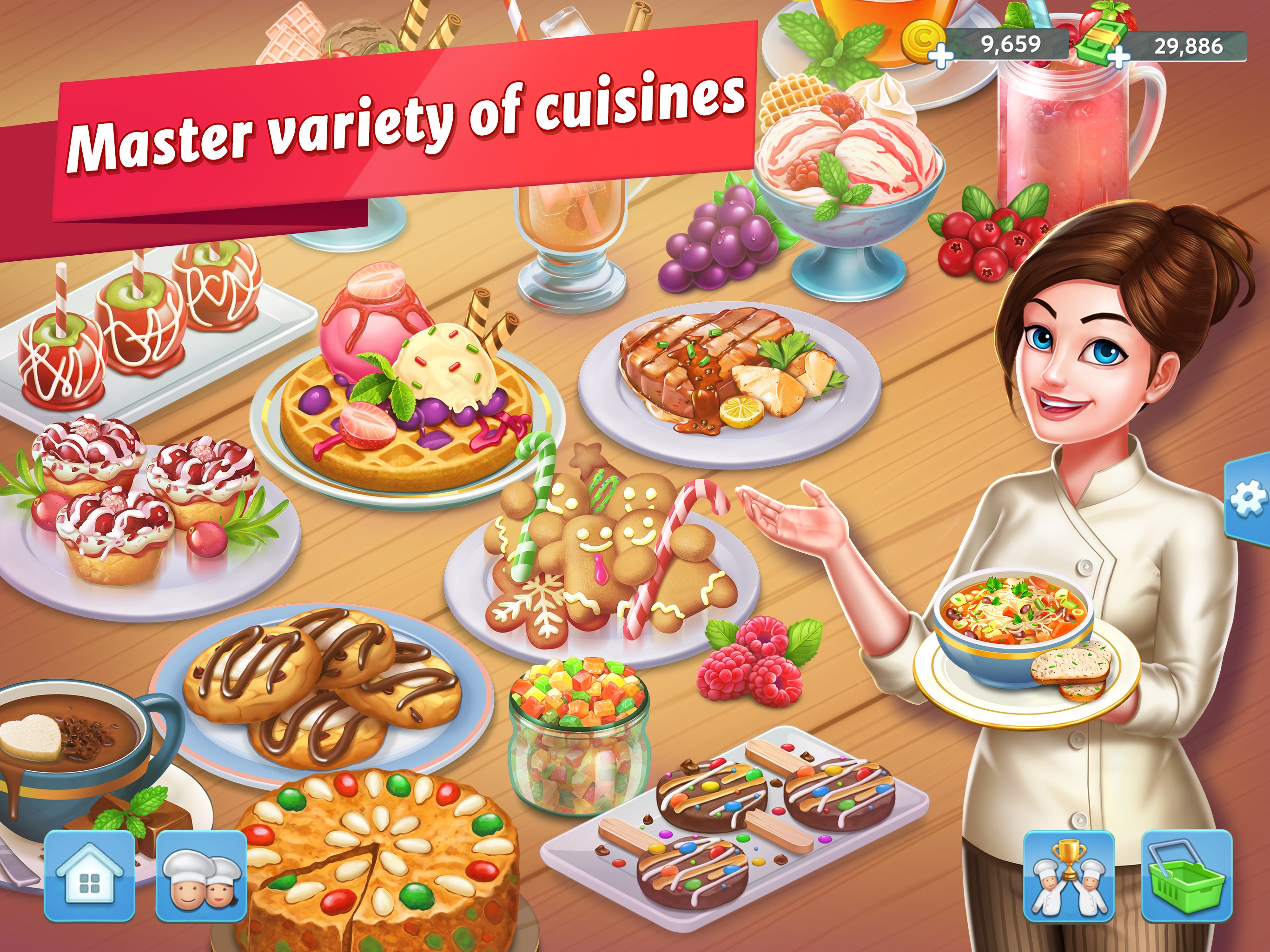 Cook and master appetizing world cuisineBuild a world-class kitchen with top-of-the-line cooking appliancesHire and manage skilled staff to help you in your kitchenCustomize and build the restaurant of your dreams with elegant wall and floor decors, stylish tables, fountains and more!Grow many varieties of fresh produce from your very own backyard! Serve delicious food to hungry foodies who visit your Restaurant!Trade cooked dishes and veggies with other Star Chef players at the Chef Truck and Chef\'s Store!Start a bustling Catering Business and expand your Restaurant Empire!Make friends with chefs around the world. Form a team and ace tournaments and get amazing chests with surprising rewards.Get ‘Likes\’ from fellow Chefs and make your Restaurant the Talk of the Town
