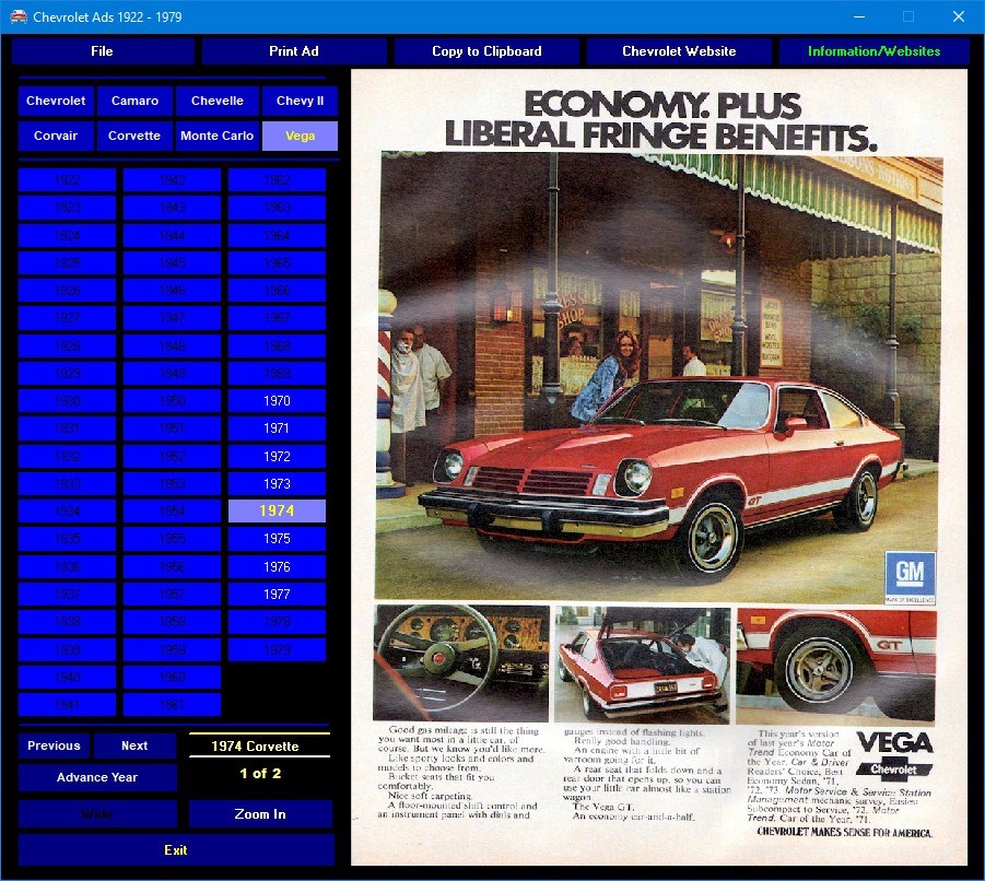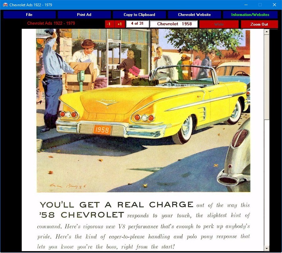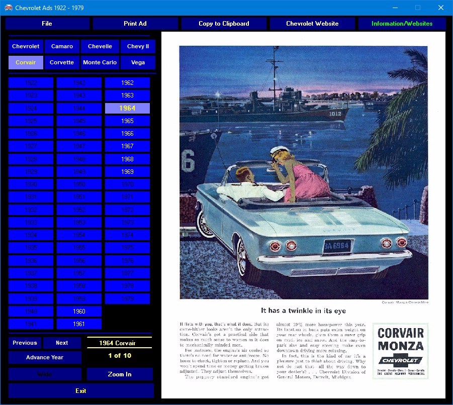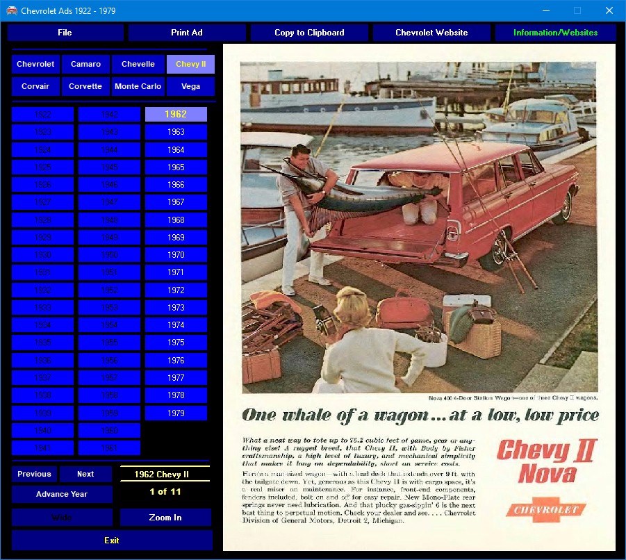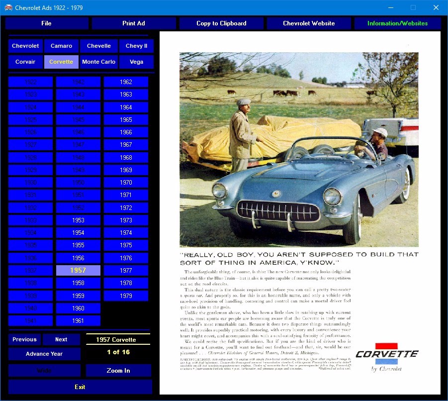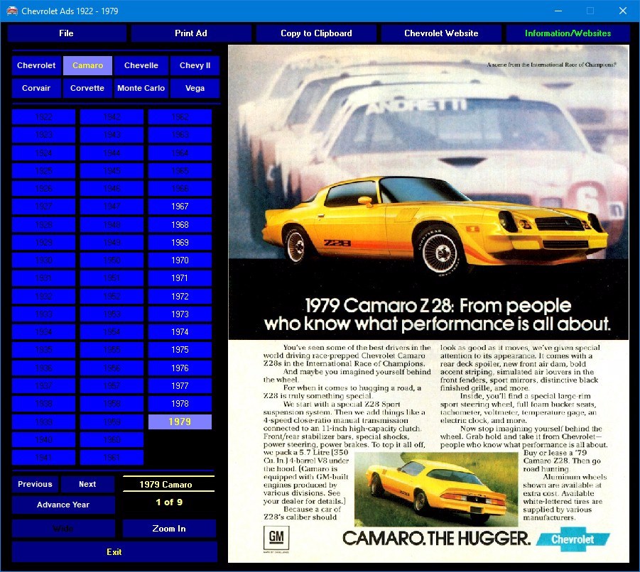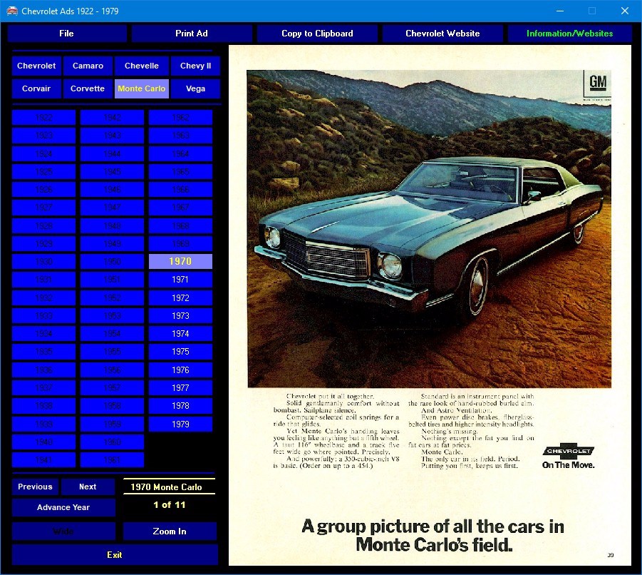 Chevrolet Ads 1922 - 1979. Take a nostalgic tour through history. Experience the style and hype of the automobile advertising industry from the glory days of cars. This collection includes well over 1400 Chevrolet magazine ads as they appeared during the period. They're all here: the Camaros, Chevelles, Chevy IIs, Corvairs, Monte Carlos, Vegas and even Corvettes.