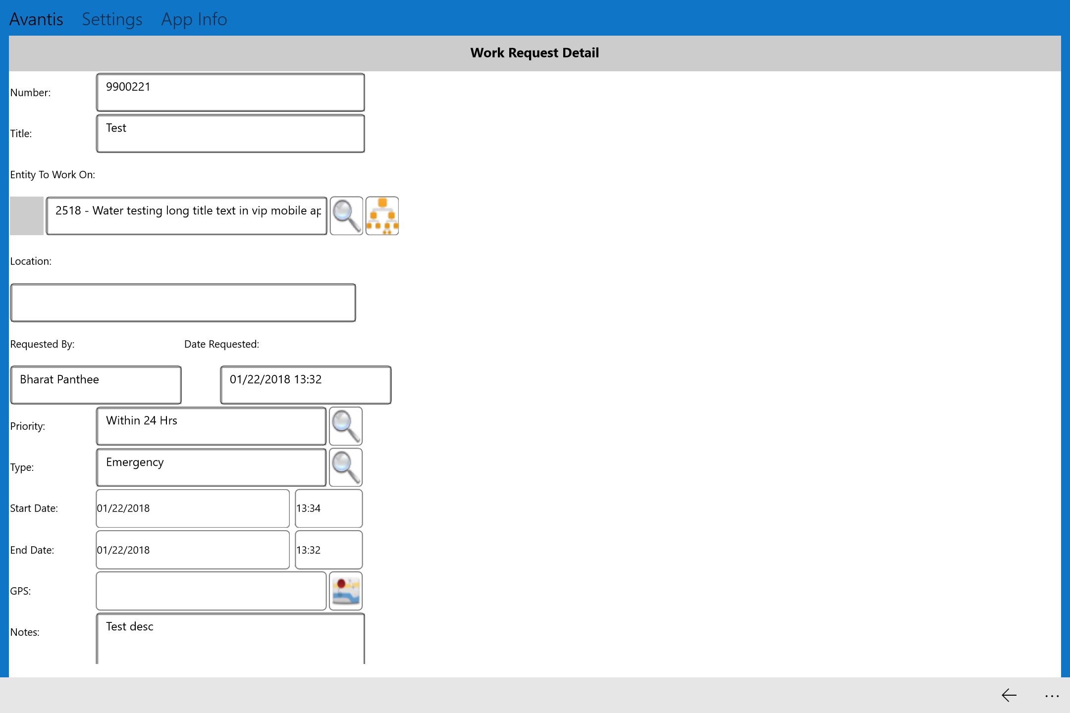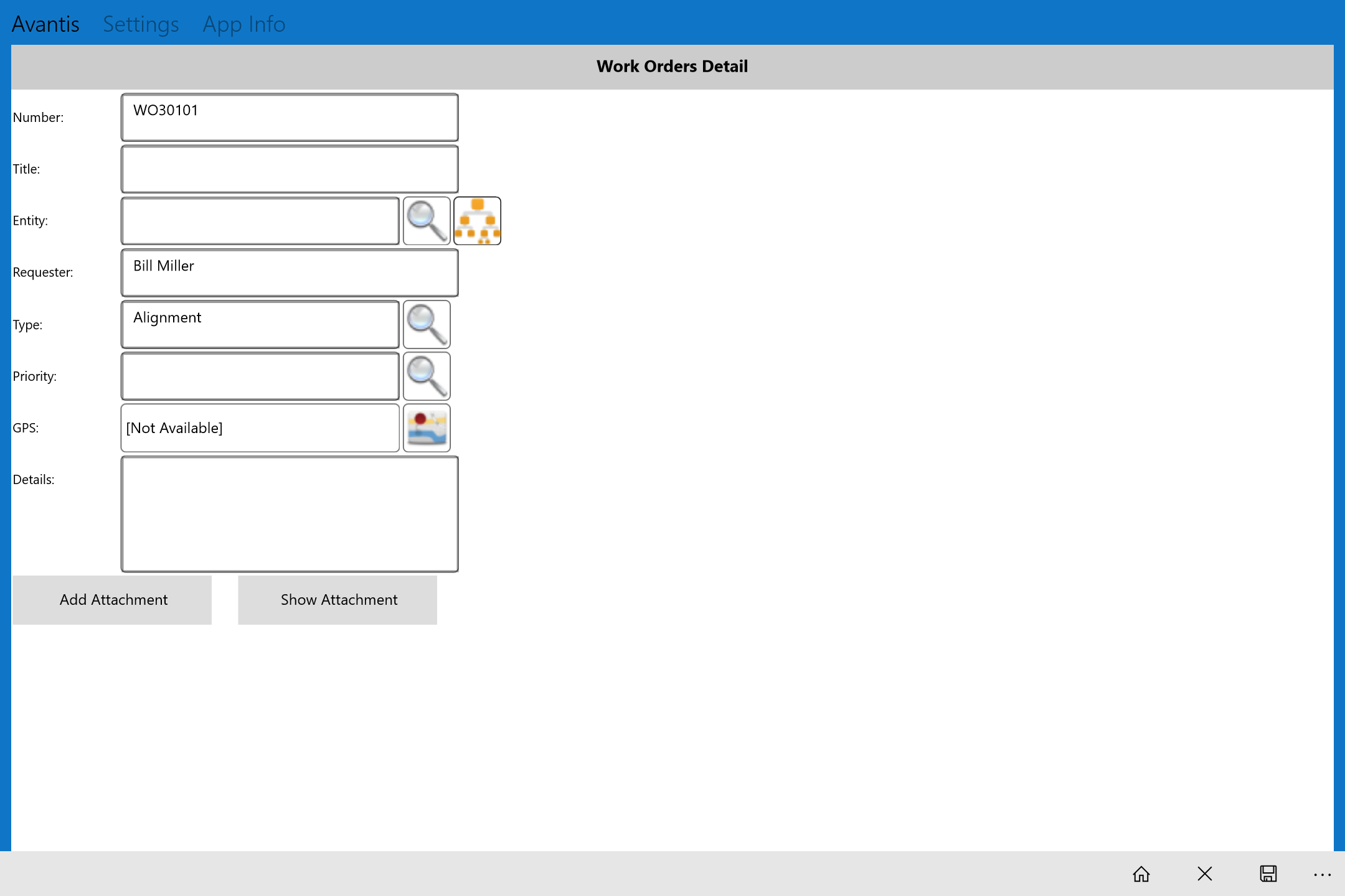 Create work requestsCreate simple and multi-task work ordersEnter time cards, Create follow-up work requestsReview and add labor requirementsReview, add and issue material requirementsEnter statisticsAdd/view attachmentsAdd GPS information