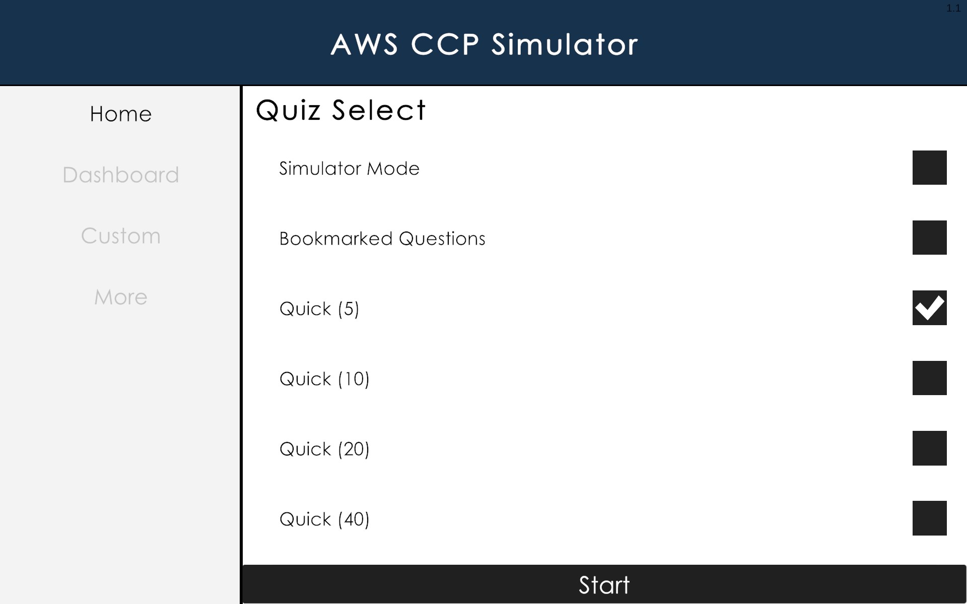 Allows you to quickly start a 5, 10, 20, 40, 50 question exam with randomized questions.
