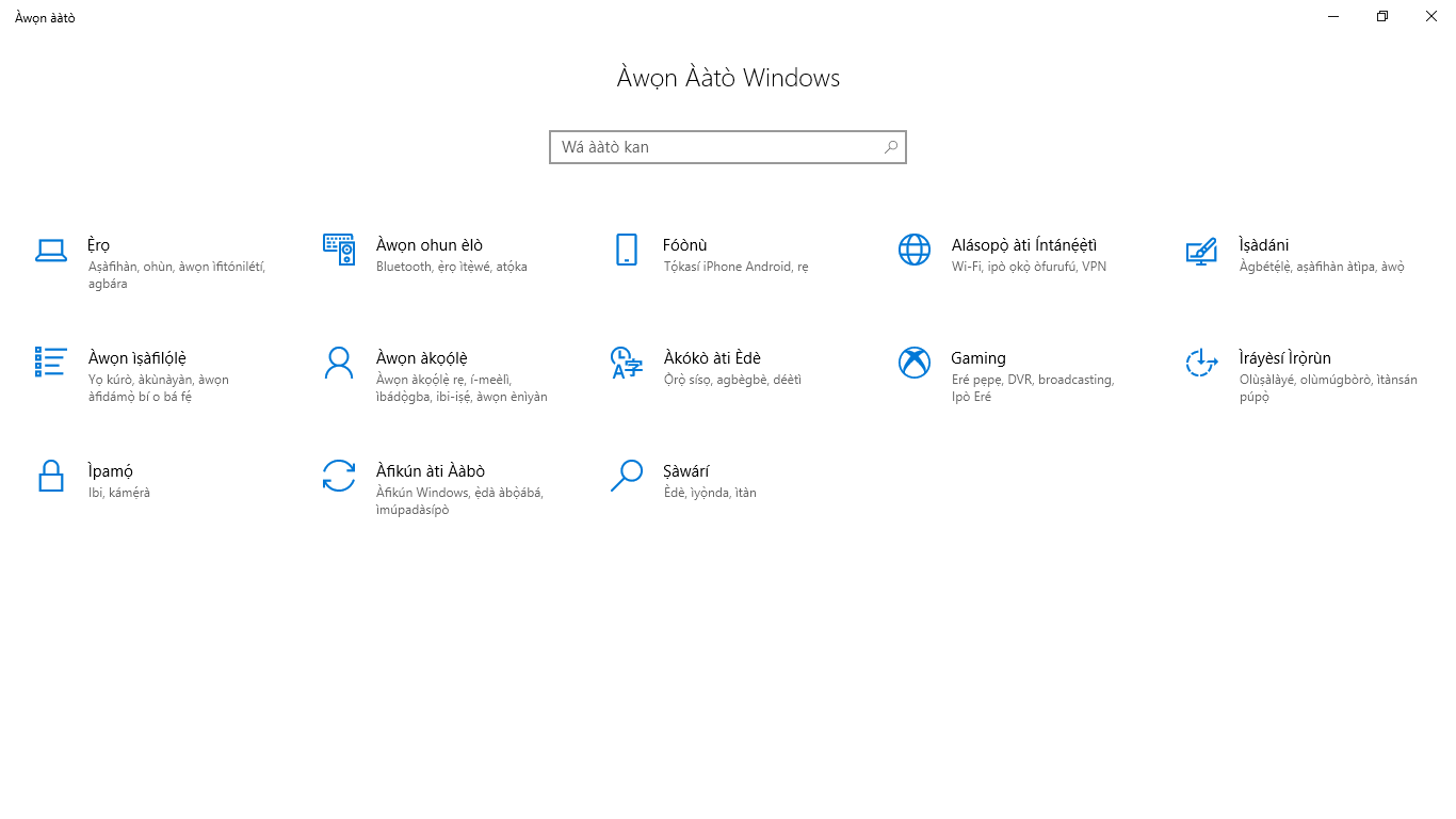 Lo Àkójọpọ̀ Ìrírí Agbègbè láti ṣàyípadà èdè tí Windows ǹ lò lórí PC rẹ fú ìyípo, àwọn mẹ́nù, àwọn ìfiránṣẹ́, àwọn ààtò, àwọn àkọ́lé ìrànwọ́, àti àwọn wúnrẹ́n tókù. O lè gba ọ̀pọ̀lọpọ̀ Àkójọpọ̀ Ìrírí Agbègbè láti Microsoft Store fún ohun èlò kanáà. Ṣíṣípòpadà láàrín wọn gba ìṣíratẹ̀ díẹ̀ lóri ojú ìwé Agbègbè àti èdè nínu Àwọn ààtò.