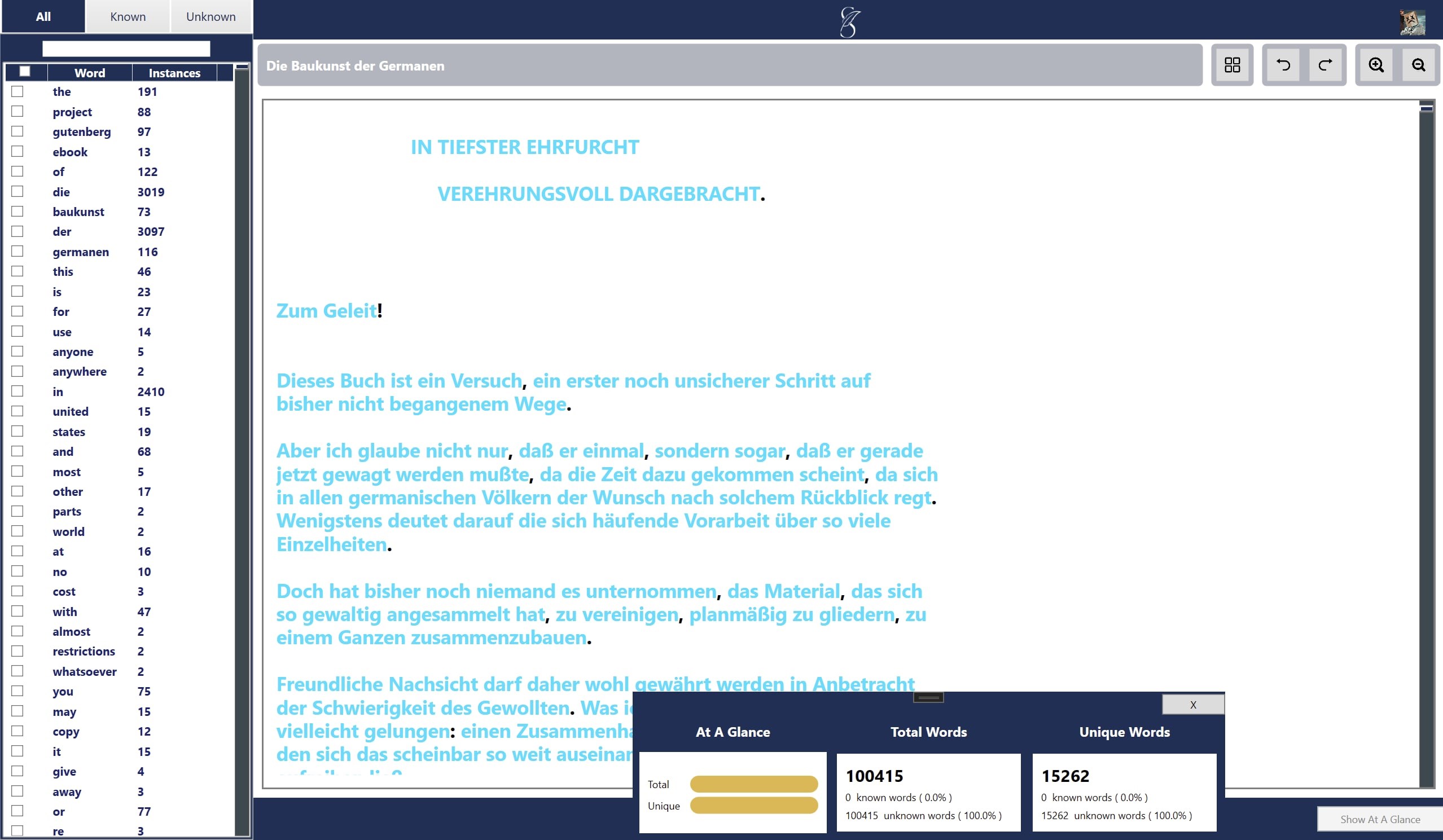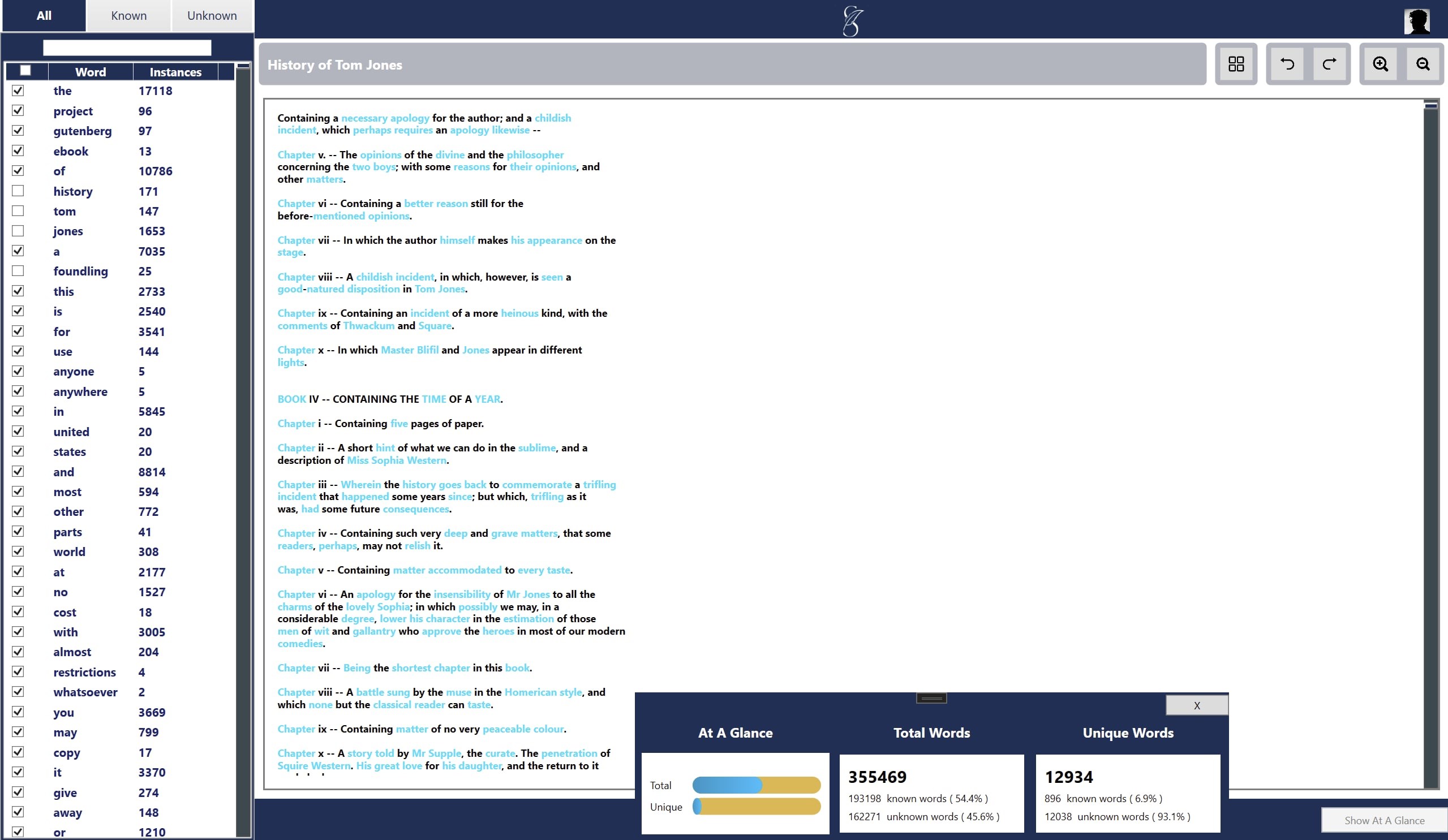 - keeps track of which words you know, and which ones you don\'t- creates a frequency list of all of the vocabulary in any uploaded document (.txt files only)- displays how many unique words are in the document, compared to how many words there are in total